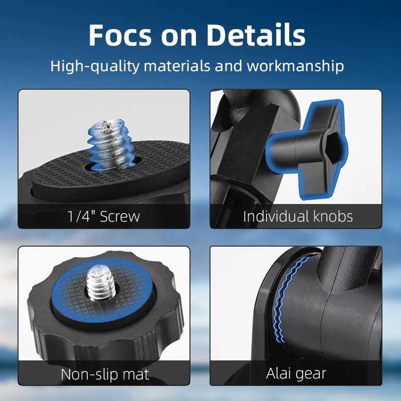 5.El perno de 1/4" es ampliamente compatible con cámaras deportivas (serie POCKET, serie ACTION, serie INSTA360), clips para teléfonos móviles y otros usos.
