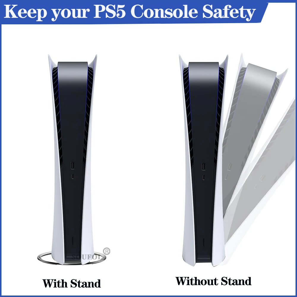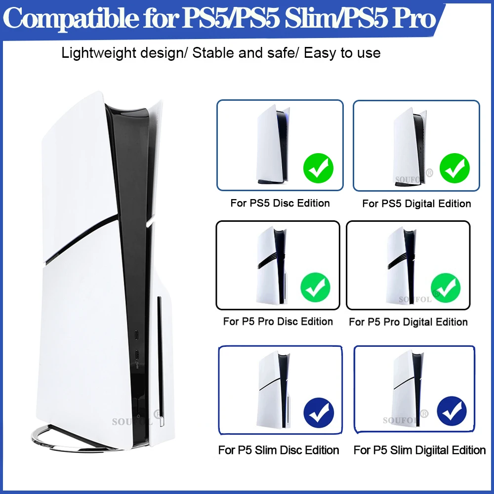 Soporte Vertical de Metal portátil de 4 colores para PS5 Pro y PS5 Slim y PS5 versión de disco Digital soporte de Base antideslizante para consola PS5Descripción:Adecuado para consola de juegos PS5 /PS5 SLIM/PS5 PRO, fácil de montar y estable.