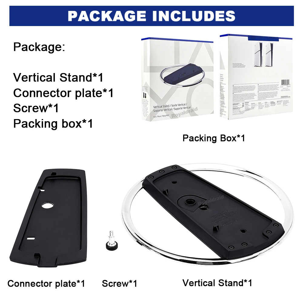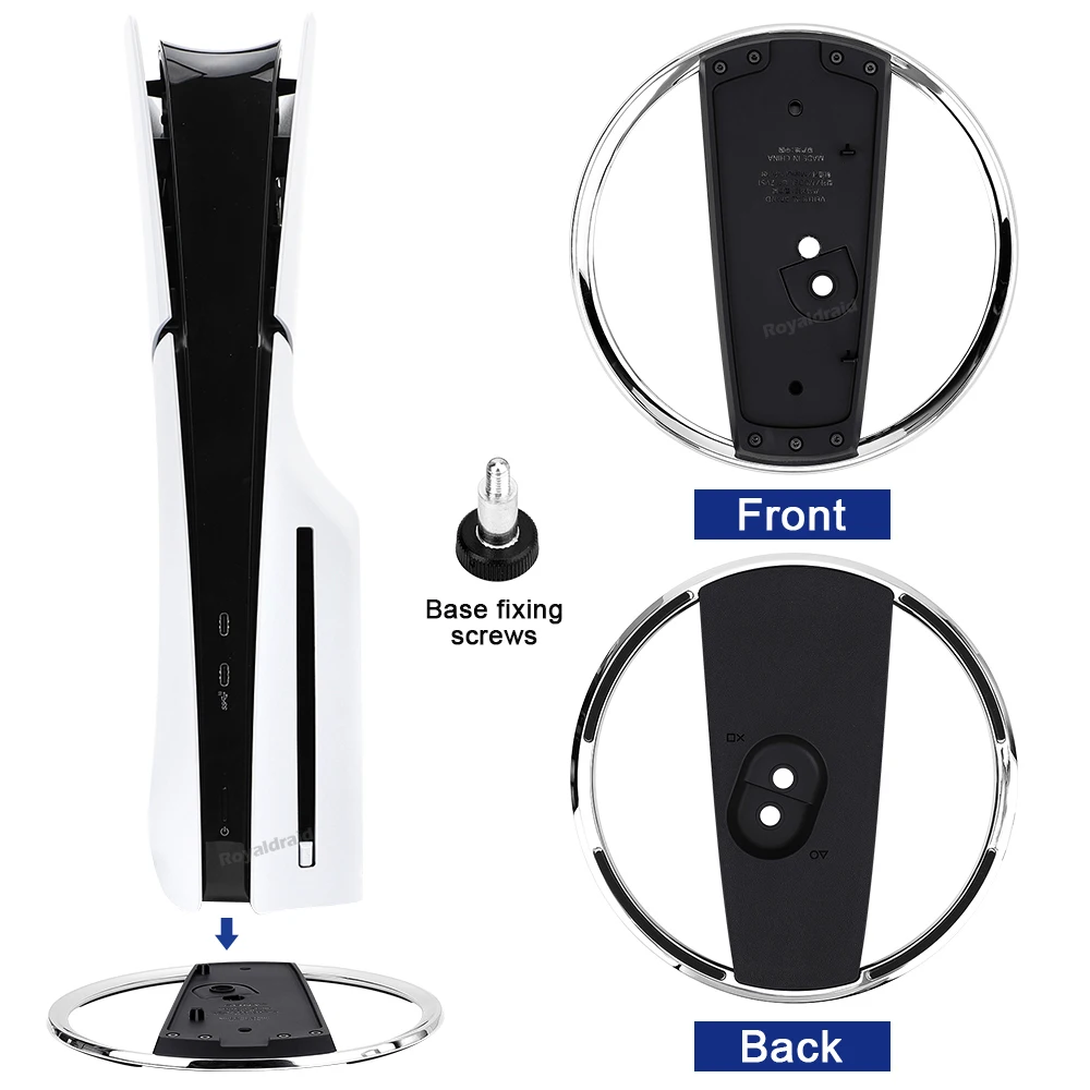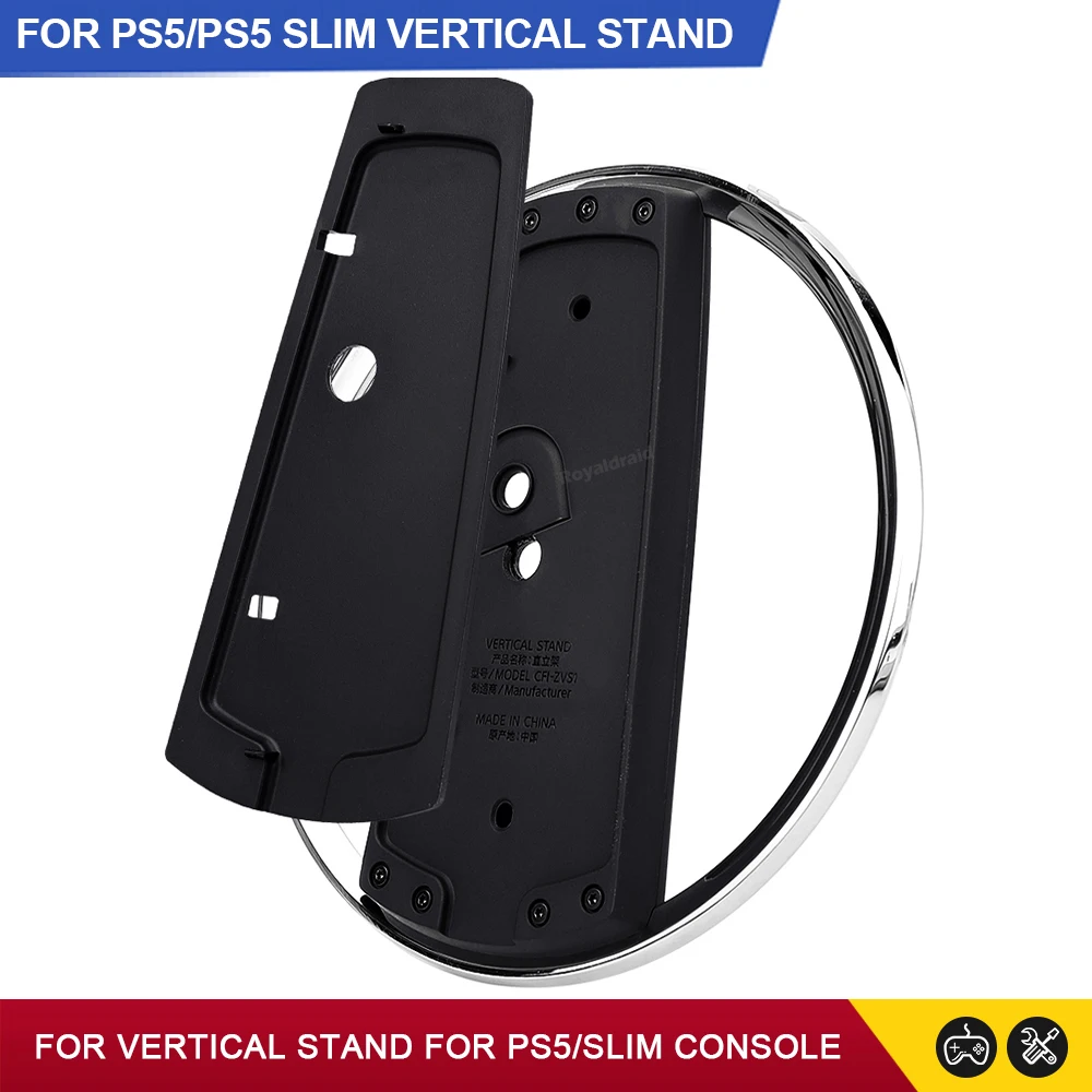 Soporte vertical de metal para disco de consola delgada PS5 y soporte digital con base de tornillo reemplazo de soporte para Playstation5 Slim HostCaracterística:Este producto es compatible con PS5 Slim Digital Edition/Dis Edtion o para PS5 Digtal Edtion /Disc Edition consolas.1. Nuevo soporte vertical para PS5/consola delgada. 2. Hecho de aleación de zinc de alta calidad, ABS sólido y almohadillas de silicona antideslizantes. Mantenga su consola estable y segura. 3. Fácil instalación, alinear con los orificios de los tornillos, apretar el tornillo y usarlo. 4. Para la consola PS5 Slim, no es necesario añadir la placa conectora.Especificación: Adecuado para la consola de juegos PS5 y PS5 para la consola de juegos PS5, fácil de montar y estable. Un accesorio conveniente para almacenar la consola de juegos en posición vertical, hace que su host sea estable y ahorre espacio. Almohadilla antideslizante inferior y diseño de orificio, estable y no afecta la disipación de calor de la consola de juegos, mejora la vida útil. Ligero y compacto en tamaño, un gran accesorio de juego para organizar su consola de juegos. Hecho de material de alta calidad, seguro y ecológico, firme y duradero. Material: PC + Metal Con logo.