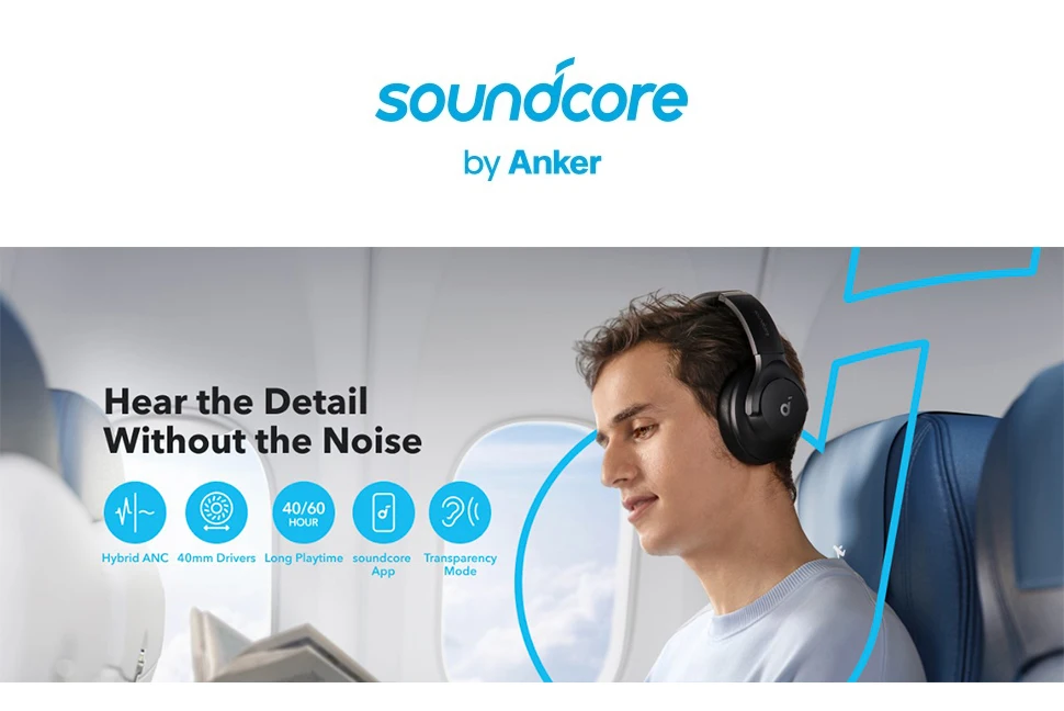 Los auriculares con cancelación de ruido Soundcore Q20i utilizan tecnología híbrida de cancelación de ruido activa para bloquear eficazmente los sonidos en tiempo real.