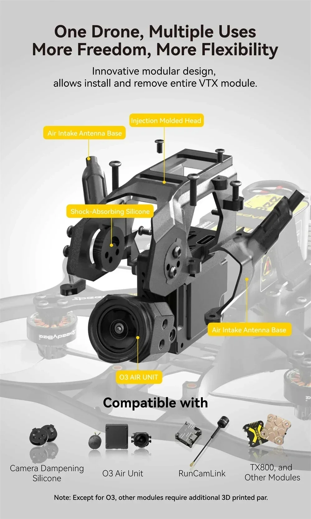 6.Diseño modular: permite la instalación y extracción de todo el módulo VTX, brindando libertad y flexibilidad para personalizar y actualizar la configuración de su dron para diversos usos.