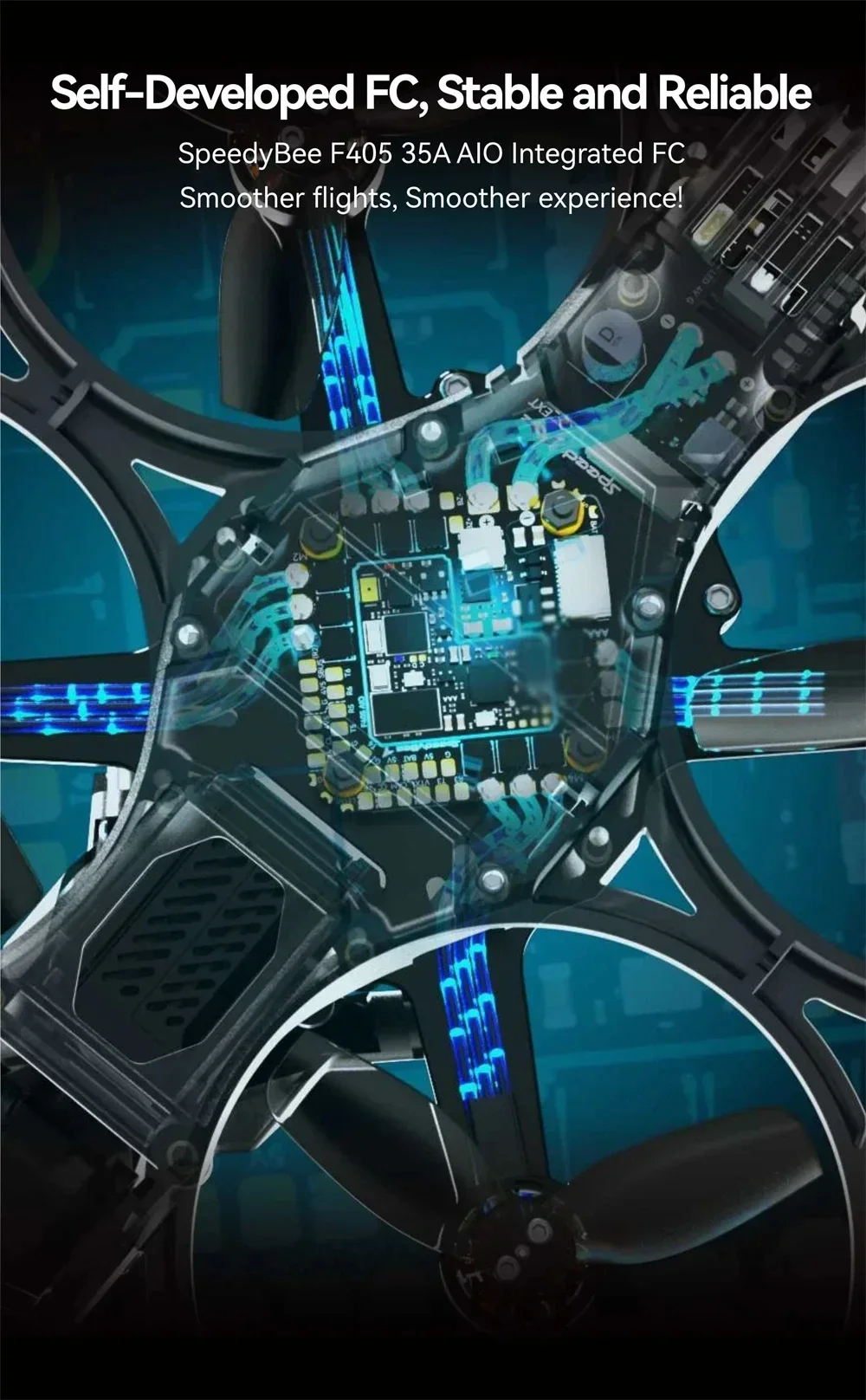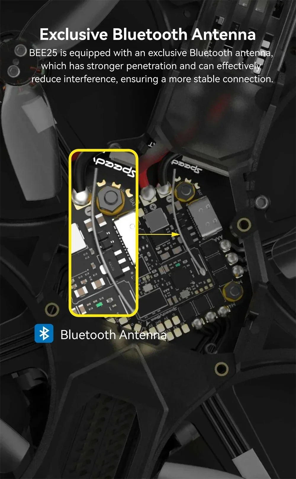 10. Conectividad superior: la exclusiva antena Bluetooth garantiza una penetración más fuerte y interferencias reducidas, proporcionando una conexión estable y confiable para sintonización inalámbrica, actualizaciones de firmware y ajustes de LED a través de la aplicación SpeedyBee.