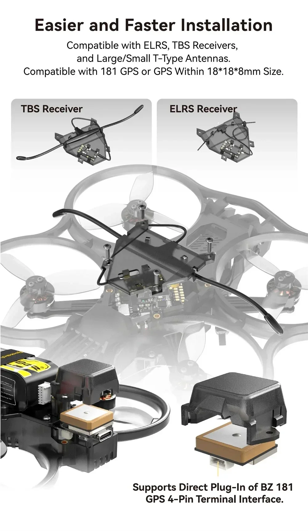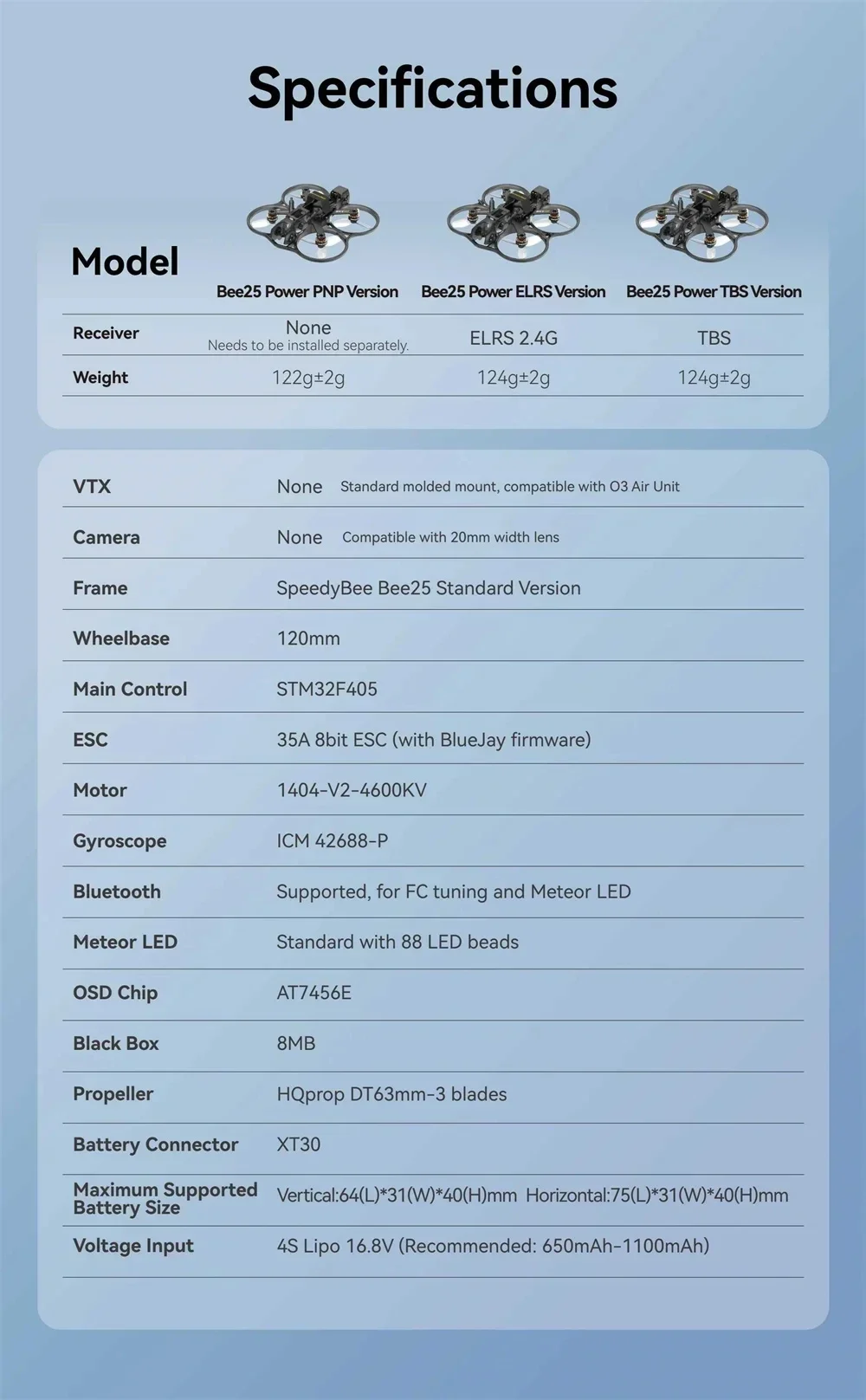 2.Diseño modular versátil: Con un diseño modular innovador, Bee25 le permite instalar y quitar todo el módulo VTX con facilidad.Esta flexibilidad lo hace perfecto para la práctica diaria, capturar momentos de la vida o cine profesional, ofreciendo libertad y versatilidad en cada vuelo.