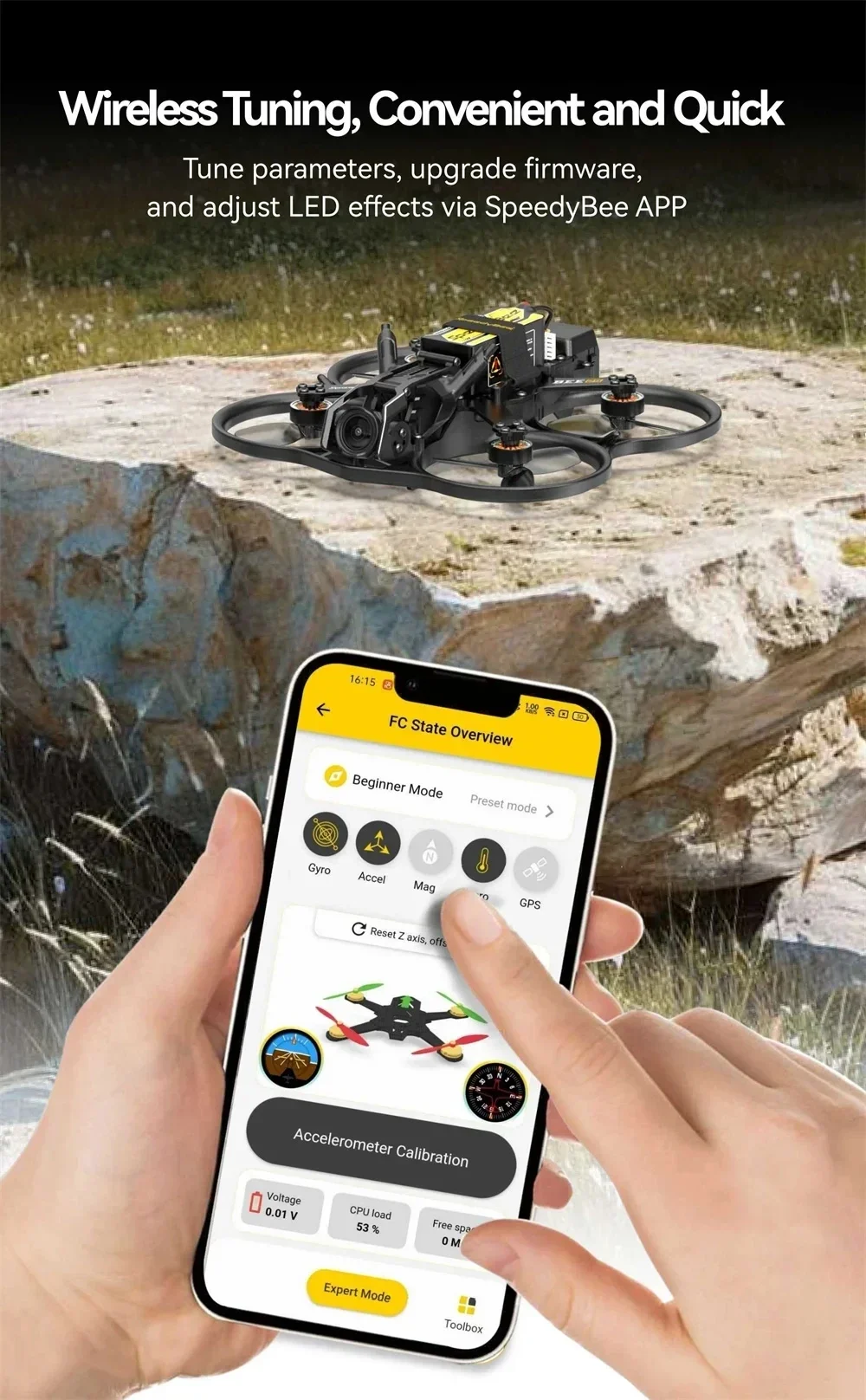 9.Apto para principiantes: la aplicación SpeedyBee ofrece un proceso de despegue guiado paso a paso, configuraciones con un solo clic, cambio de modo de vuelo e instalación de GPS, lo que la hace accesible y fácil de usar para principiantes.
