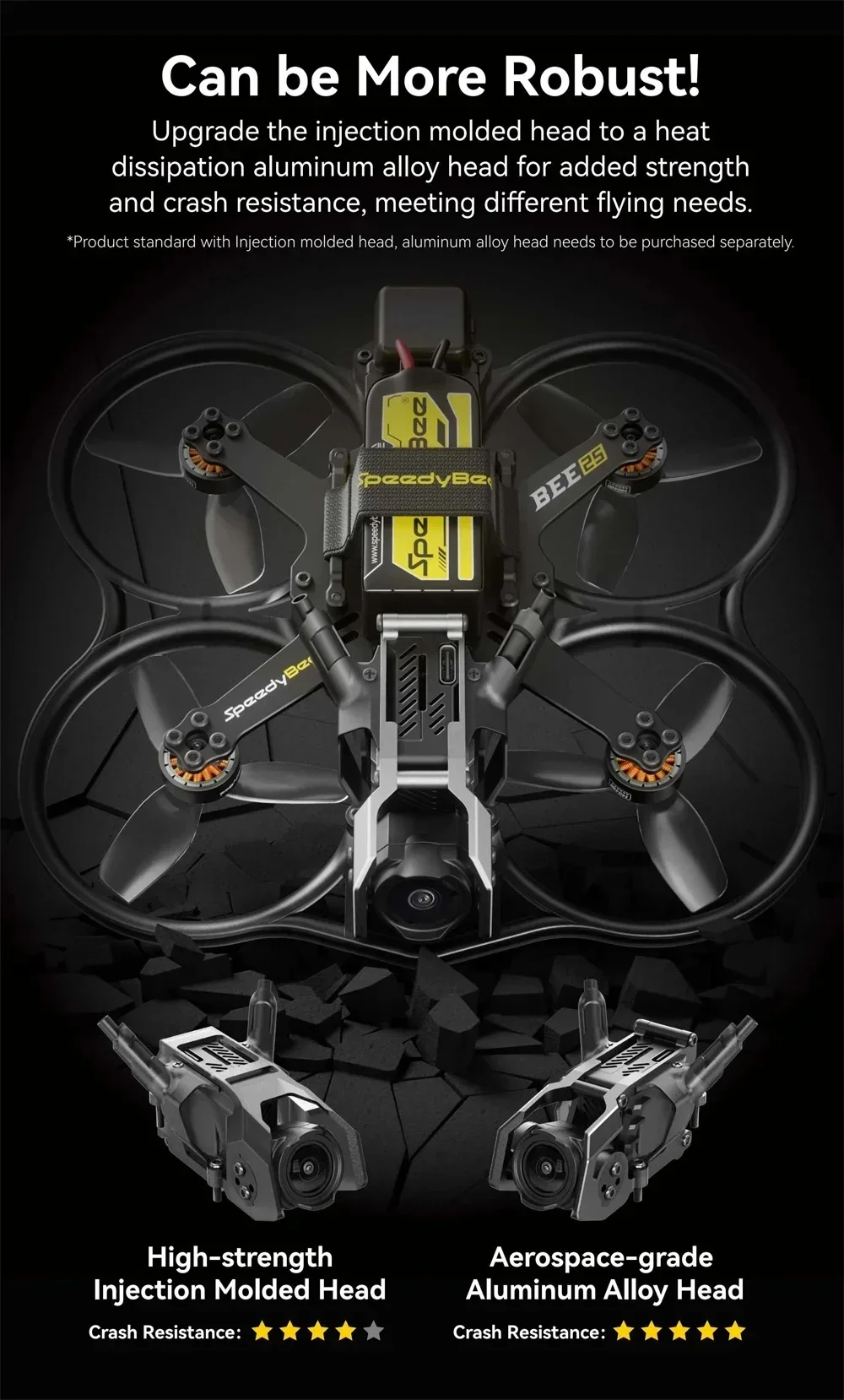 3.Durabilidad mejorada: el cabezal moldeado por inyección estándar se puede actualizar a un cabezal de aleación de aluminio con disipación de calor (se vende por separado) para proporcionar mayor resistencia y resistencia a choques.Esta actualización garantiza que Bee25 satisfaga diversas necesidades de vuelo, proporcionando robustez y longevidad.