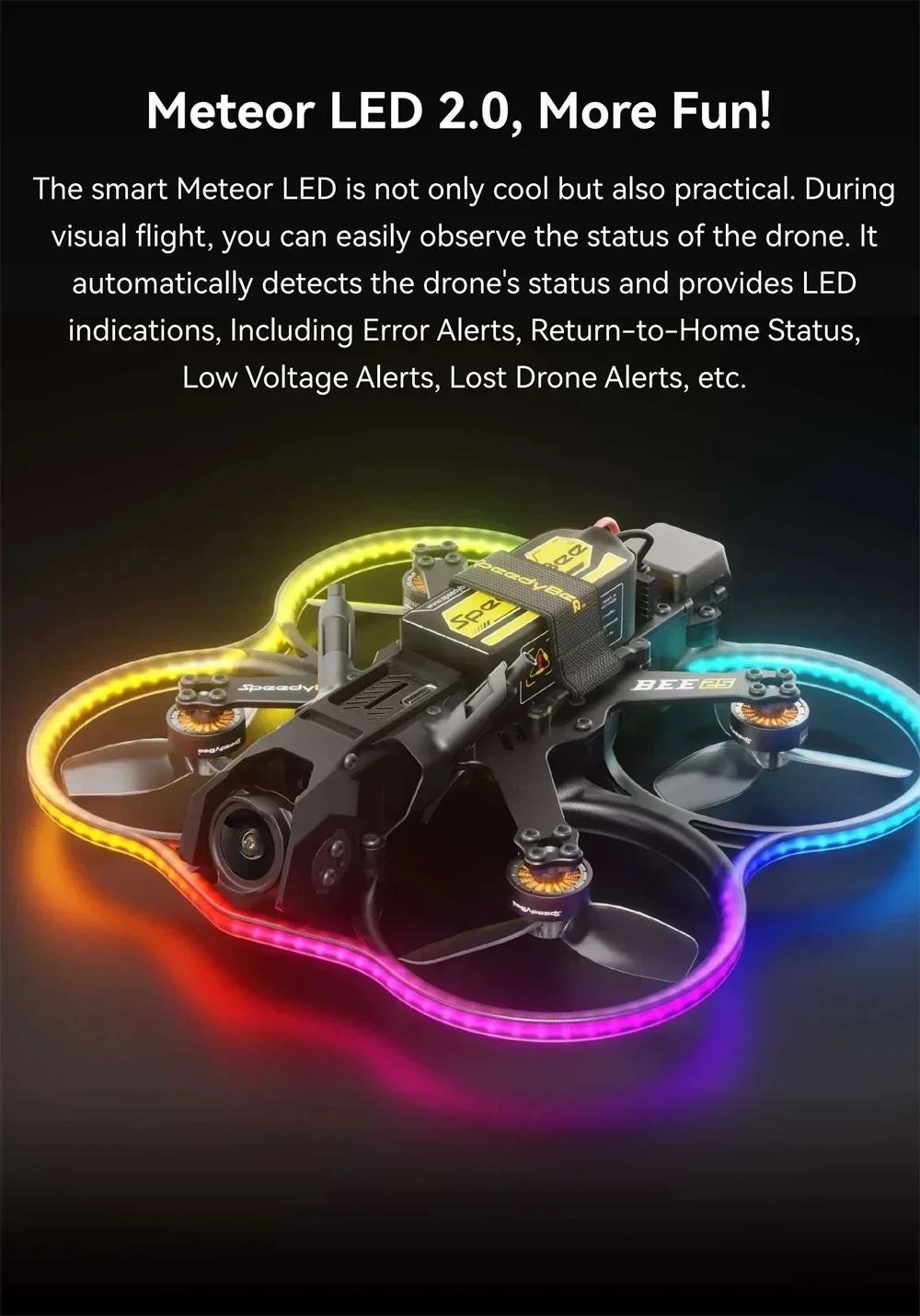 8.Indicadores LED inteligentes: el sistema Meteor LED 2.0 proporciona indicadores visuales para diversos estados, como alertas de error, regreso a casa, bajo voltaje y alertas de drones perdidos, lo que mejora la seguridad y la conciencia situacional durante los vuelos.