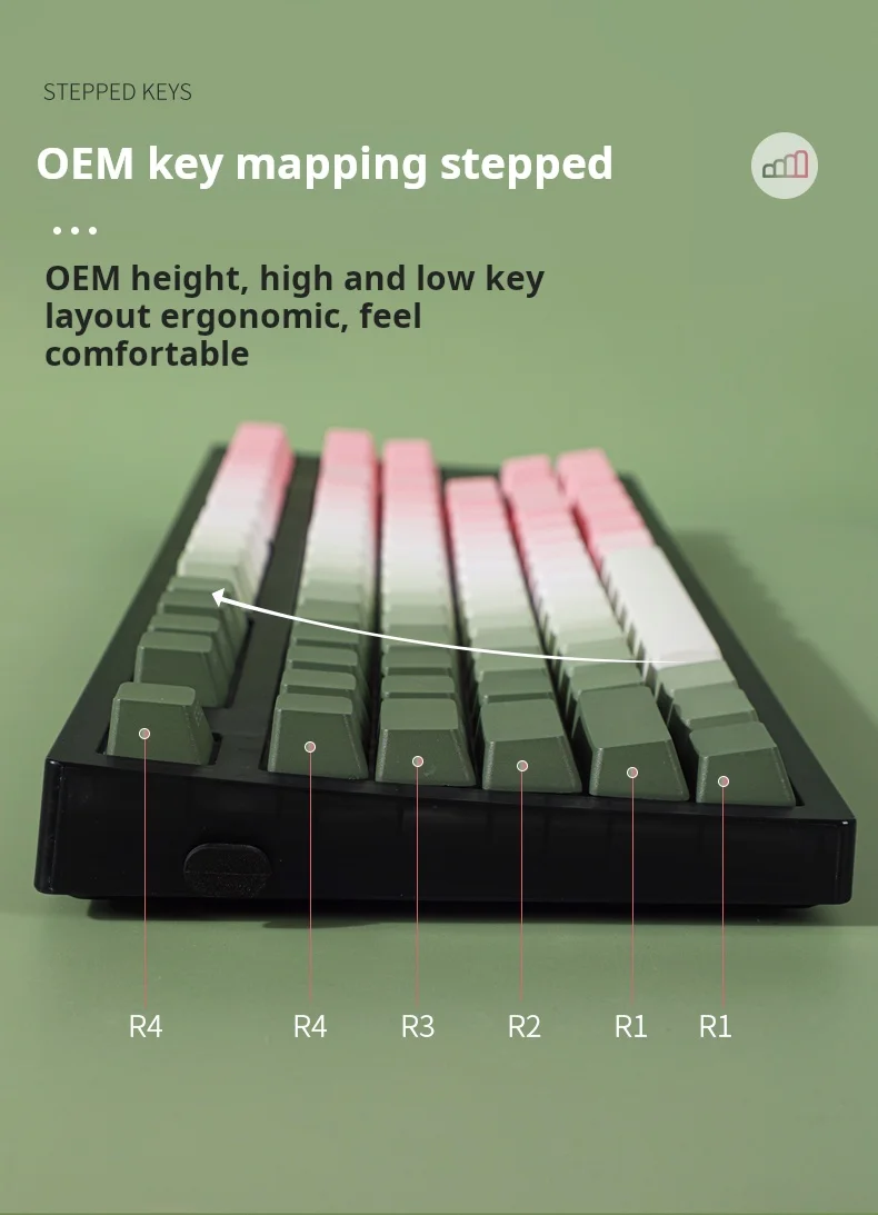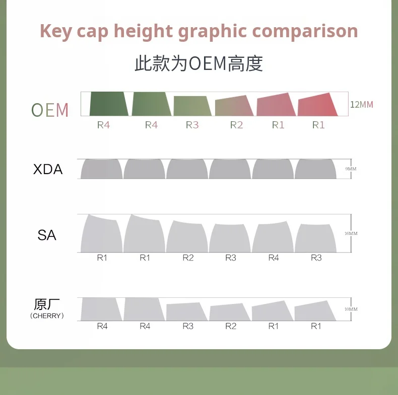140 Keys Side Print version includes 1.75U 2U shift,1.5U alt ctrl,2U 2.25U 2.75U 3U 6.25U 7U spacebar,it is compatible with 61、64、66、68、71、75、84、87、96、980、104、108, etc. layout mechanical keyboard with MX switches