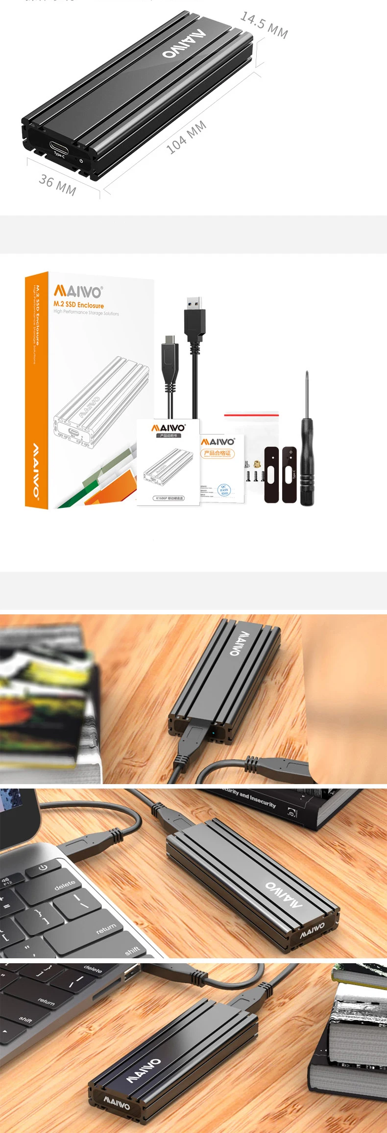 Modelo: K1686PTipo de soporte: unidad de estado sólido con protocolo M.2 NVMETamaño de soporte: 2230/2242/2260/2280MMInterfaz de soporte: TYPE-CMaterial: aleación de aluminioTamaño: 104*36*14,5mmSistema de soporte: WINDOWS/MAC OS