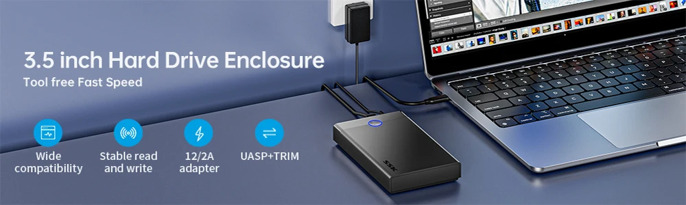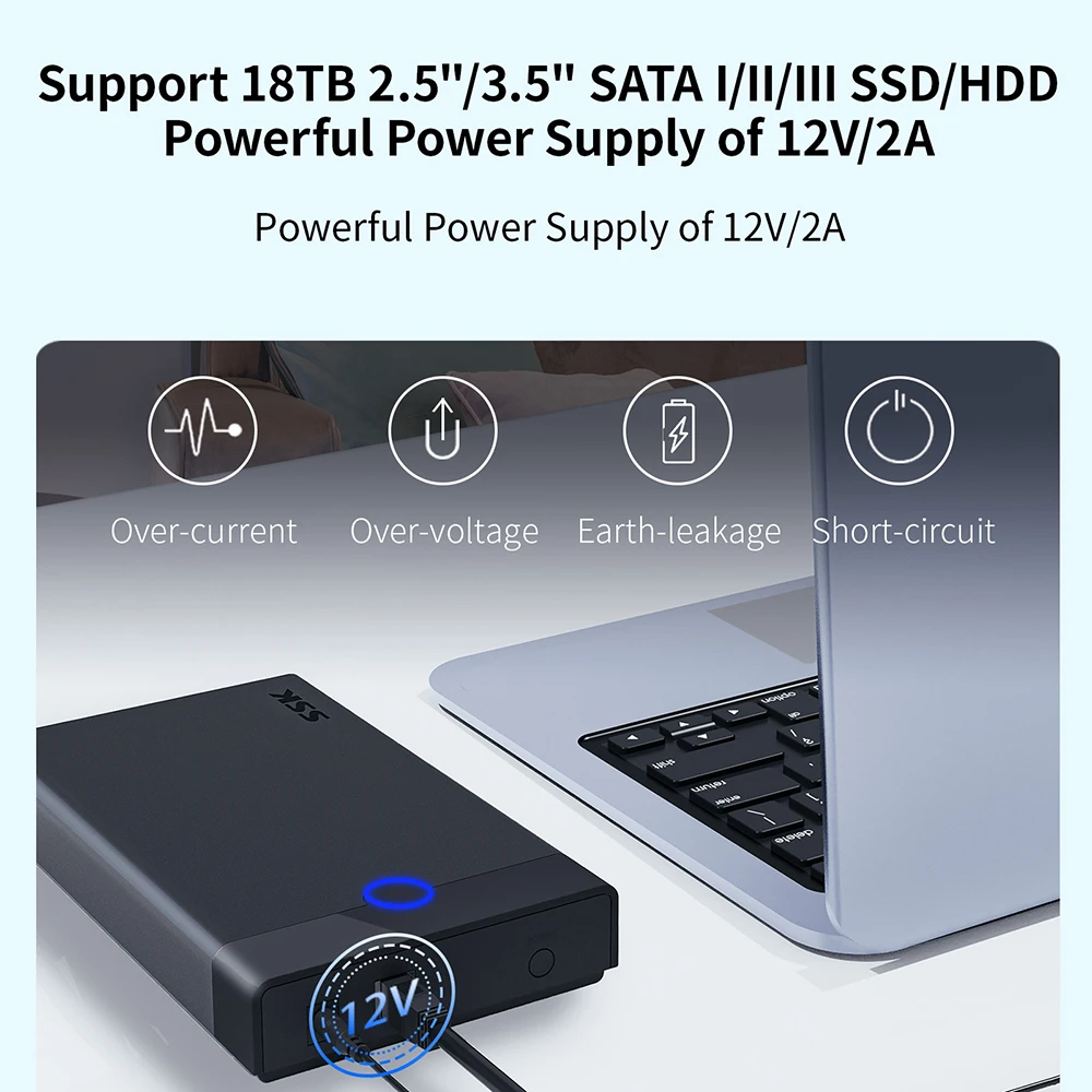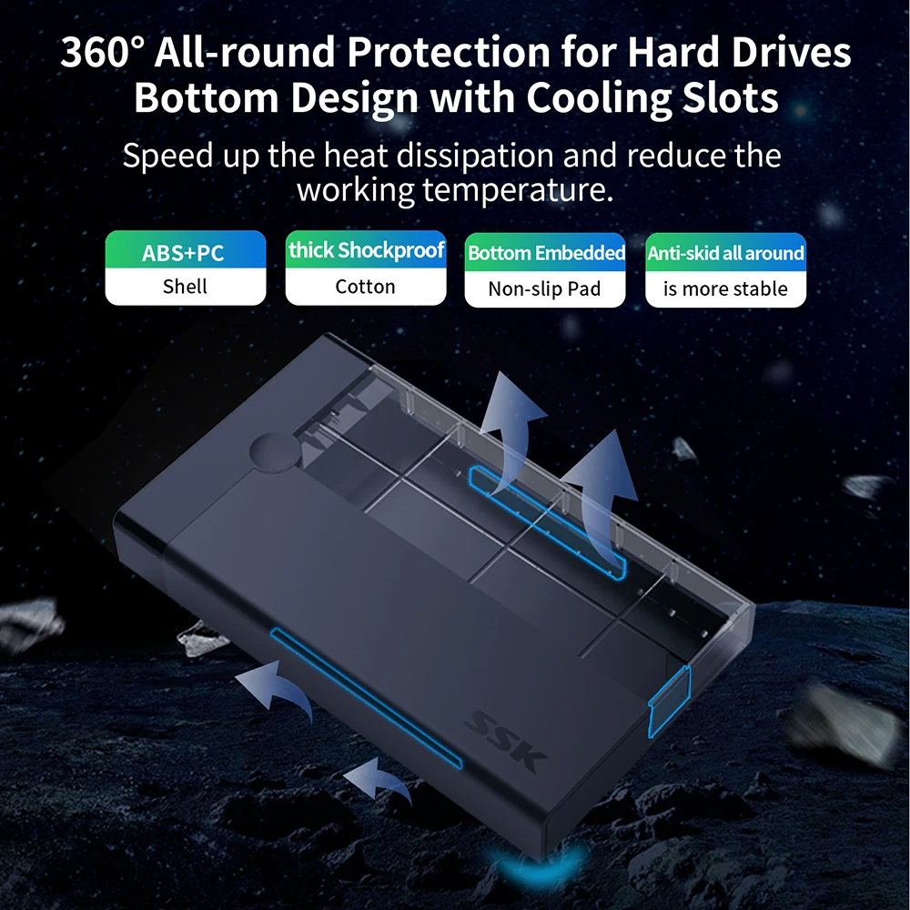 Carcasa de disco duro 1.3.5/2,5: carcasa de disco duro portátil SSK especialmente diseñada para HDD/SSD SATA de 3,5/2,5 pulgadas con un grosor de 30mm. Esta carcasa de disco duro USB admite hasta 18TB como máximo de almacenamiento portátil y conecta fácilmente su disco externo 3,5/2,5 a su piezas, ordenadores portátiles y otros dispositivos para una protección integral de sus valiosos datos.