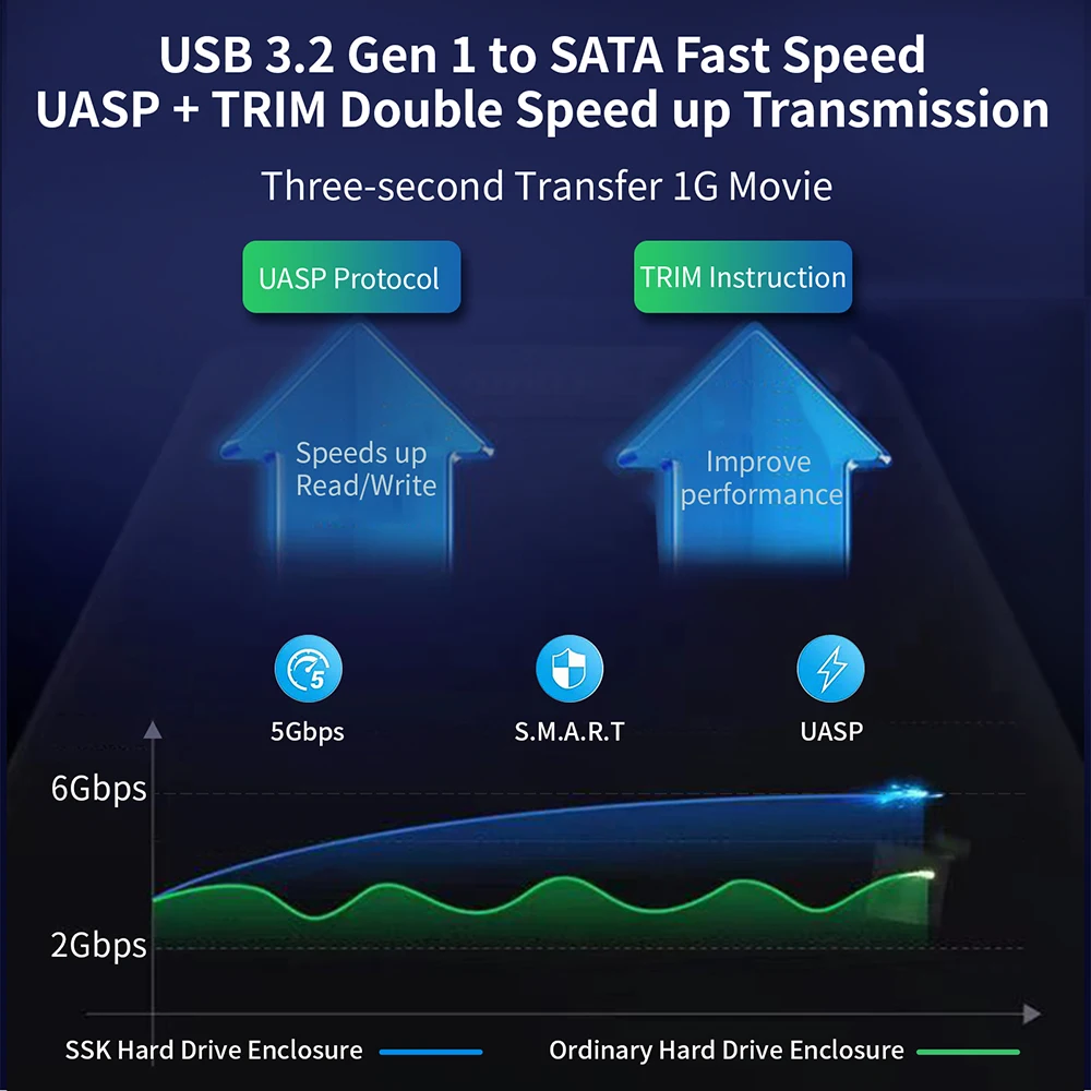 2.USB 3,2 UASP y velocidades de transferencia de 5Gbps: la carcasa del disco duro SSK 3,5 admite el protocolo de transmisión acelerada UASP, 20% más rápido que la velocidad USB 3,0 tradicional. La base SSD/HDD de transferencia de alta velocidad admite USB3.2 GEN1/USB3.0 con velocidad de lectura/escritura SSD de hasta 450 MB/S