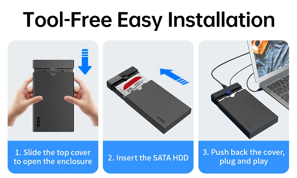 4. Diseño sin herramientas y estructura de refrigeración eficiente: la carcasa del disco duro externo SSK no requiere ninguna herramienta de instalación, lo que la hace más fácil y cómoda de usar. La carcasa del disco duro del portátil está hecha de material ABS más fuerte, además, el diseño de enfriamiento eficiente hace que el interior de la caja del disco duro no acumule calor, que protege el disco duro para que no se ejecute durante mucho tiempo