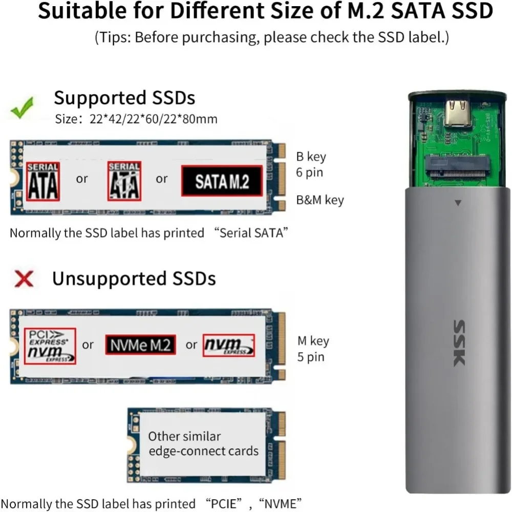 【SSD applicable】-Esta carcasa SSD M.2 de 1. 2 6Gbps de 2. ª generación admite controladores de estado sólido M.2/NGFF basados en SATA (llave B y llave B + M) SSD 2242 2260 2280mm, no es compatible con NVMe/PCIe M.2 M Key SSD; Incluye cable USB tipo C a USB 3,2 (tipo A) y Adaptador tipo C. Antes de comprar, verifique la etiqueta de su SSD. Si imprime PCIE, NVME, esta carcasa no será compatible.