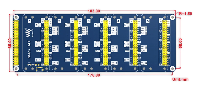 This is an I/O expansion kit designed for Raspberry Pi, which provides 5 sets of 2x20 pinheaders, that means a handy way to "stack" multi different HATs together, and use them as a specific combination / project.