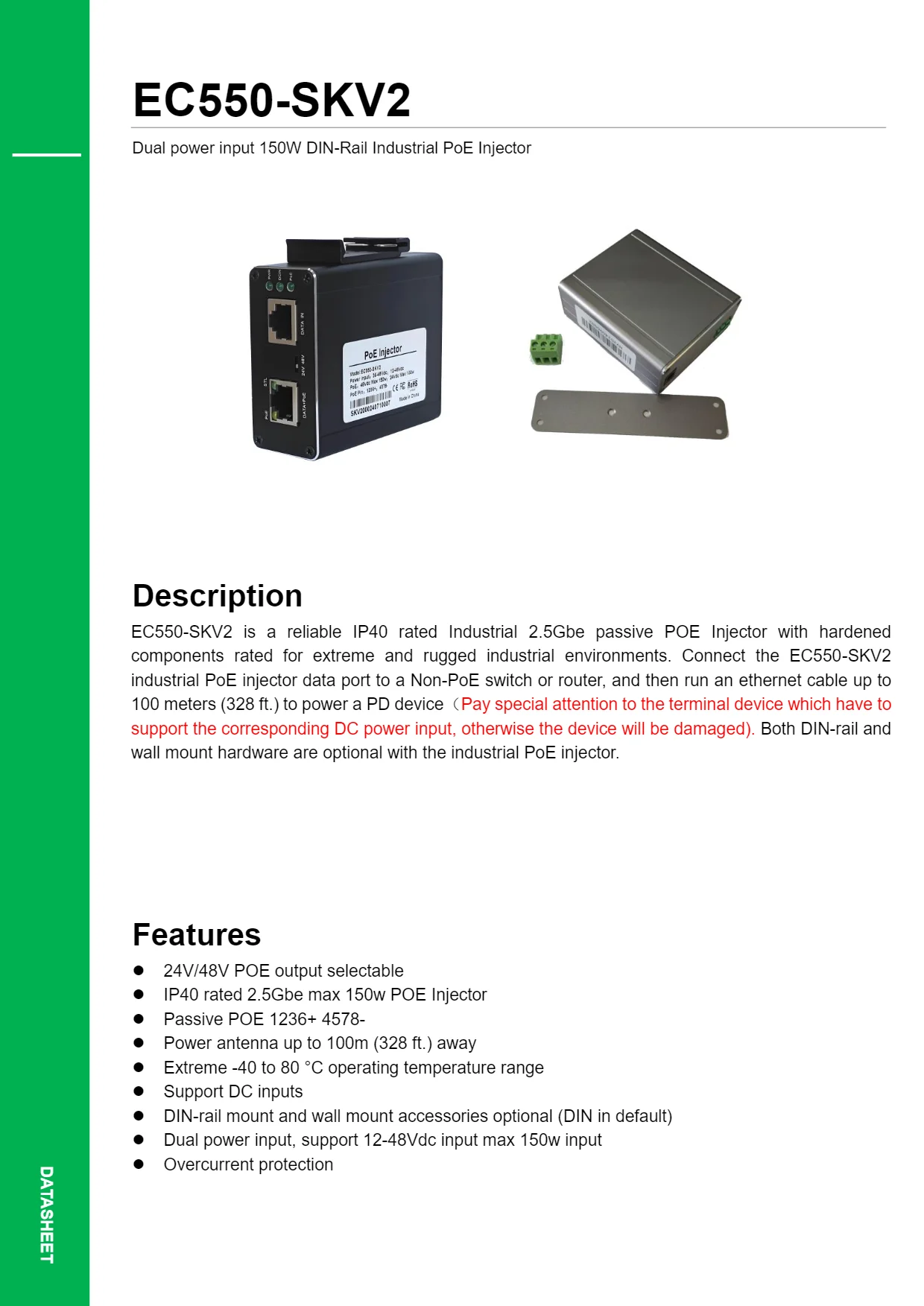 El inyector POE se entregará con un terminal DC por defecto, y si lo desea