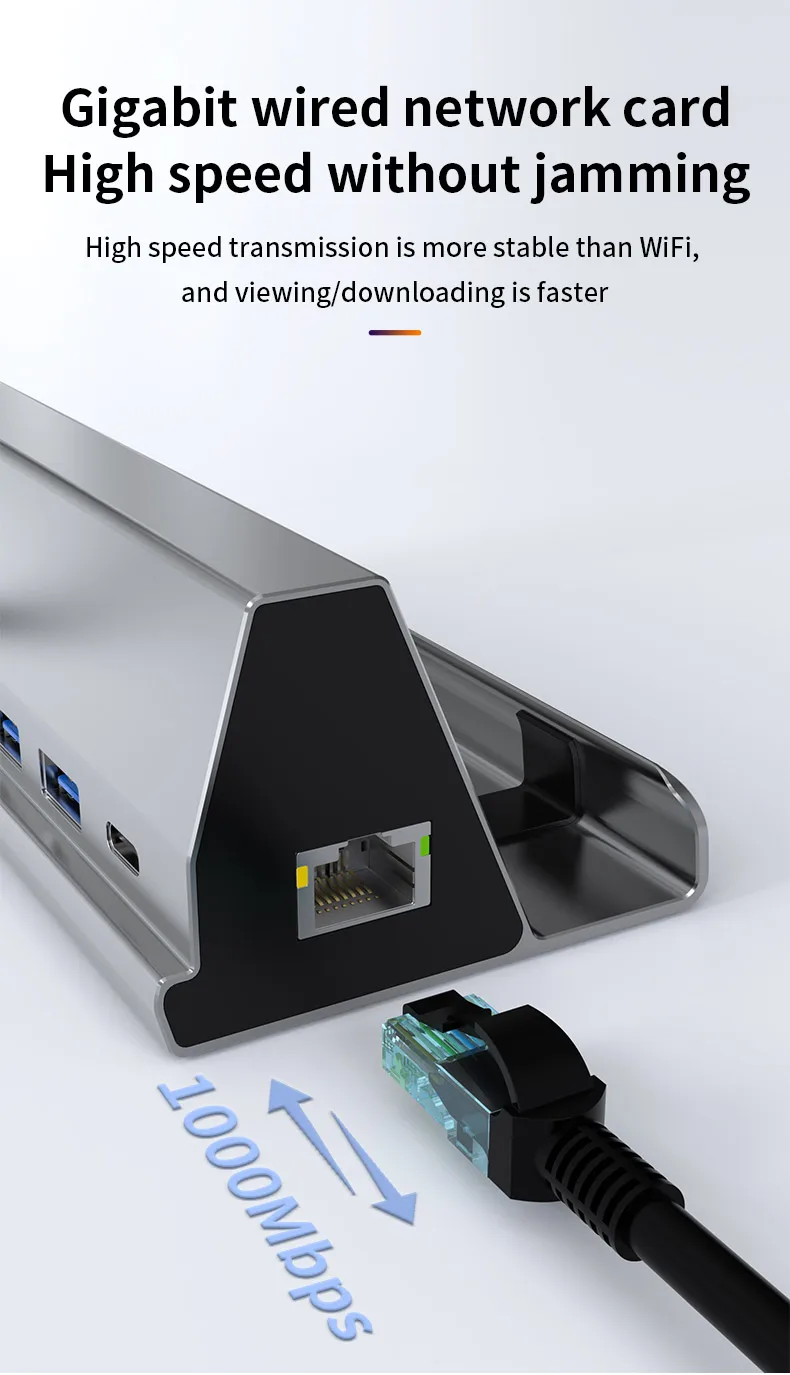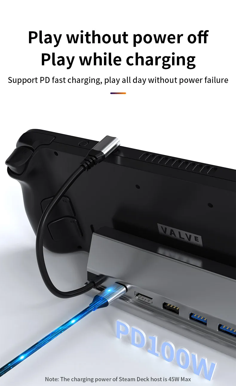 La base de TV está diseñada para la plataforma de vapor, equipada con una salida HDMI de 4K @ 60Hz, un puerto de carga PD USB tipo C y 3 puertos de datos USB 3,0. Puede disfrutar jugando videojuegos en la TV mientras su dispositivo también está cargando.