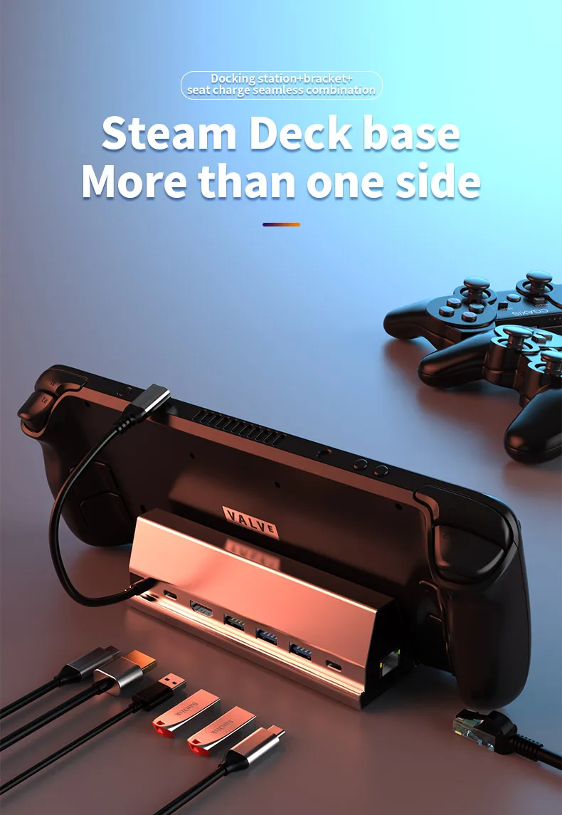 La base de carga es para Steam Deck, también para Nintendo Switch (boca abajo), y también compatible con algunas tabletas, teléfonos inteligentes, etc. con puertos de USB-C. Viene con puerto USB 3,0 USB C.
