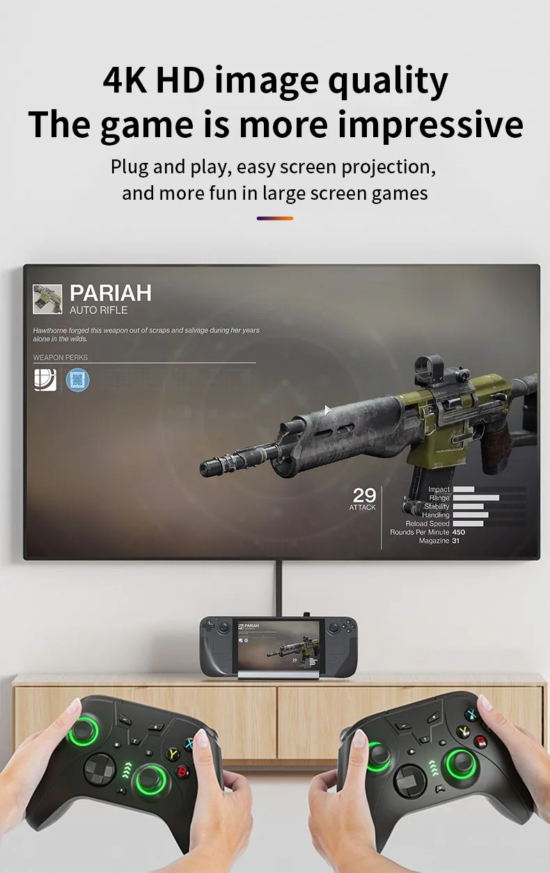 El muelle viene con una salida HDMI 4K @ 60Hz, el muelle puede proyectar la página del juego Desde su plataforma de vapor a un televisor o monitor. Los jugadores tendrán una mejor experiencia de juego mientras juegan en una pantalla grande.