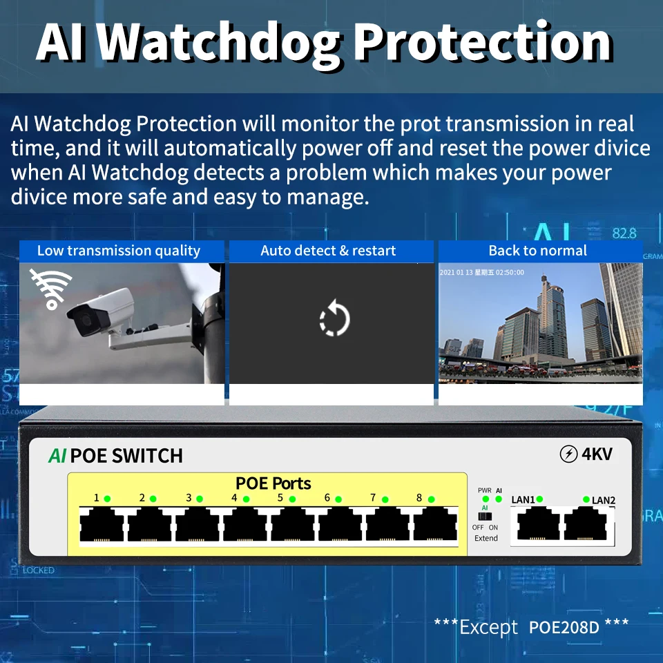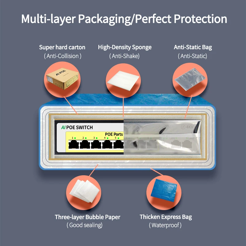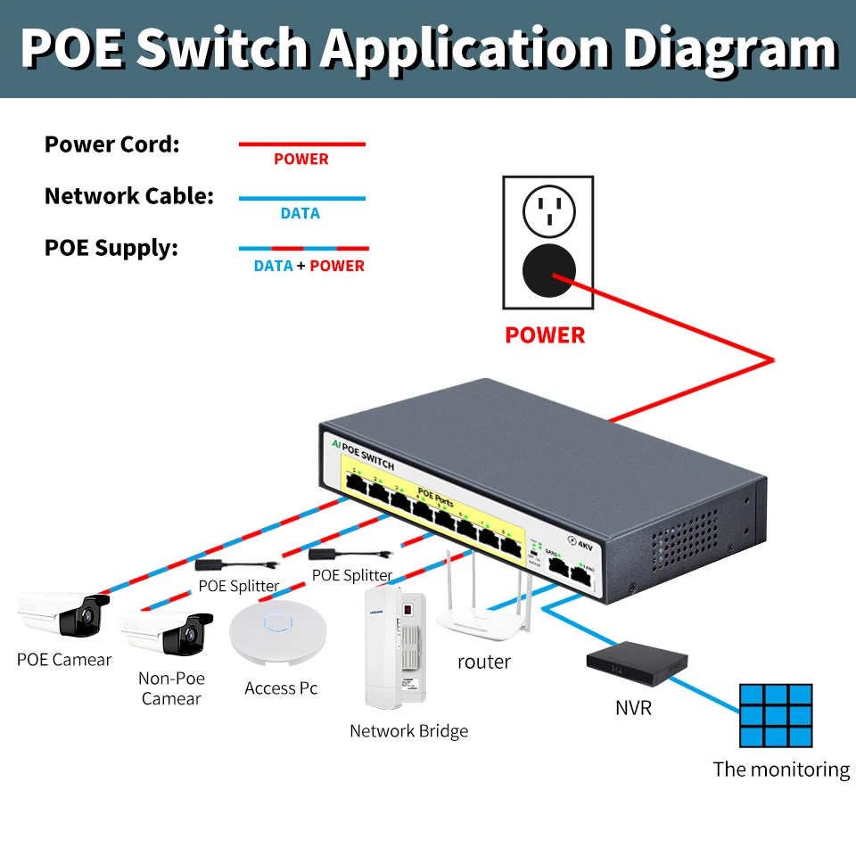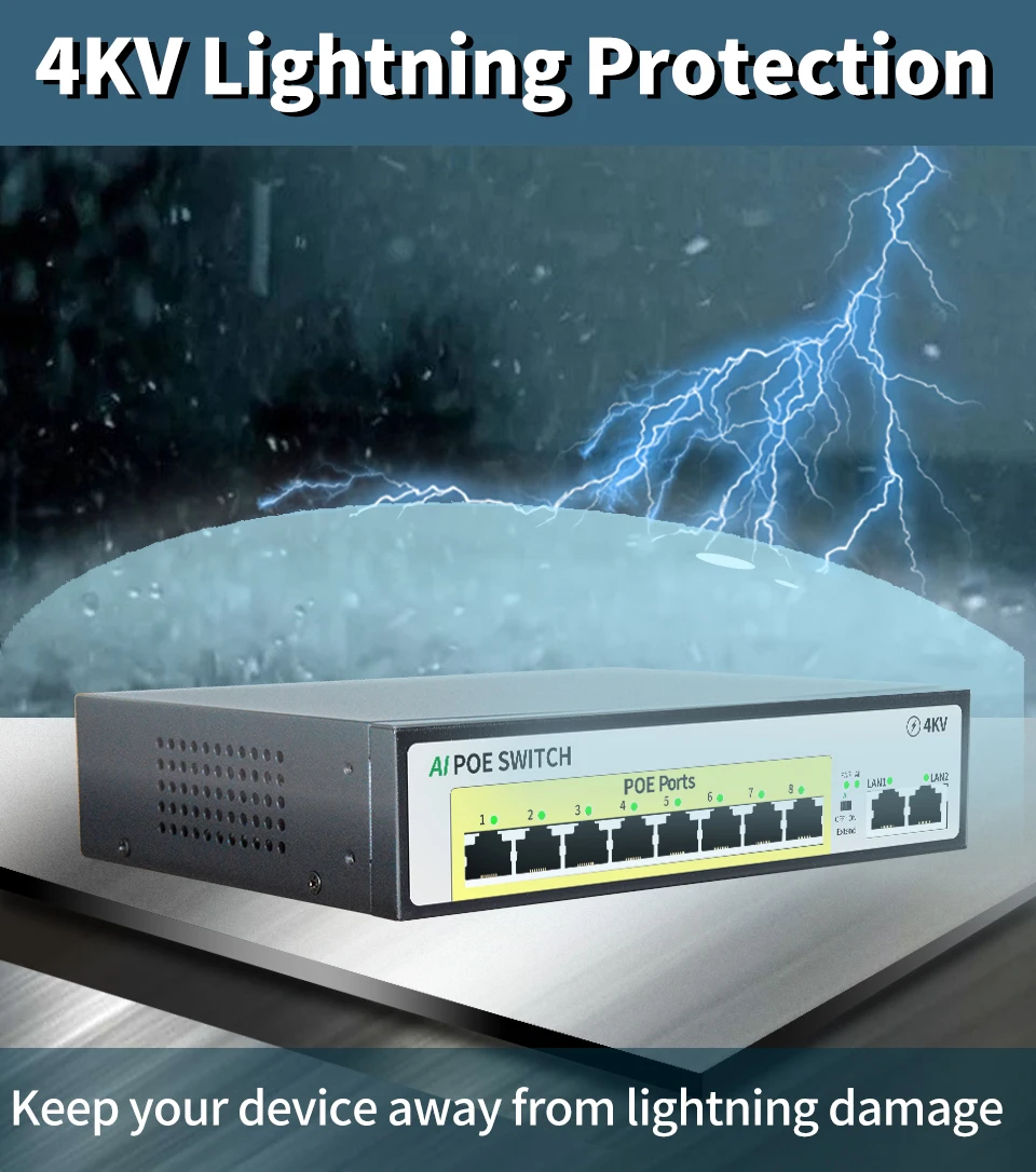 Adopta el último chip de conmutación Ethernet de alta velocidad y tiene capacidades de procesamiento de datos extremadamente rápidas para mejorar un rendimiento de transmisión de datos fluido. Todos los puertos RJ45 admiten fuente de alimentación de cable de red.Es adecuado para Hikvision,DAHUA y otras marcas con dispositivos alimentados por PoE 802.3af/802.3at.