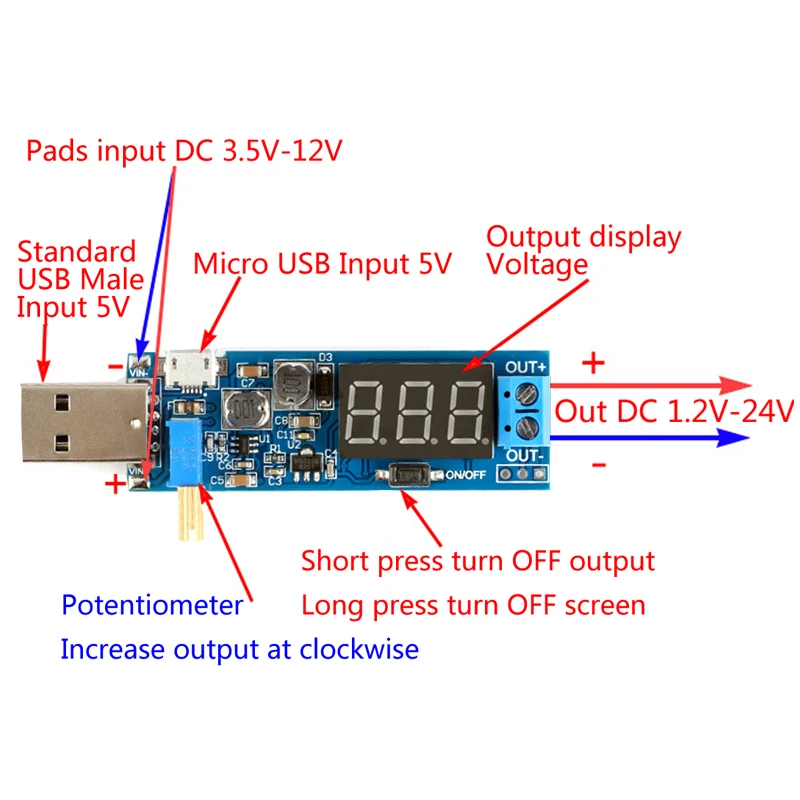 stlxy1.Descripción:Módulo de fuente de alimentación USB boost/buck, alimentado por USB, ajusta el potenciómetro para obtener el voltaje requerido.2.Características:1 .Un botón para apagar la salida;2 .Fornece la pantalla de visualización ON/OFF;3 . Admite modo de bajo consumo;4 . Admite modo de suspensión;5 . Admite voltaje de entrada USB y Micro USB estándar y almohadillas;6 .Potenciômetro con mango giratorio.3.Parámetros:1 .Voltaje de entrada: CC 3,5-12 V;2 .Voltaje de salida: CC 1,2-24 V;3 .Potencia de salida:Entrada 1,2-2 V, potencia de salida dentro de 2 W;Entrada 2V-20V, potencia de salida dentro de 3W;Entrada 20V-24V, potencia de salida con 2,5W;4 .Pantalla: pantalla de tubo digital de 3 bits;5 .Tamaño: 80*20*14mm.4.Pasos de uso:1 .Voltaje de entrada desde USB estándar o Micro USB o 'VIN+' y 'VIN-';2 .Encienda la pantalla;3 .Ajuste el potenciómetro para obtener el voltaje requerido;4 .Conecte la carga.5.Aplicación:1 .Fuente de alimentación ordinaria;2 .Cargador de batería;3 .Potencia de accionamiento LED;4 .Pantalla de voltaje del instrumento;5 .Medidor de prueba;6 .Prueba de circuito;7 .Conversión de potencia.6. Tenga en cuenta:1 .No es una fuente de alta potencia, úsela dentro del rango de potencia.7.Paquete:1 .1pc XY-UP USB boost/módulo de fuente de alimentación buck