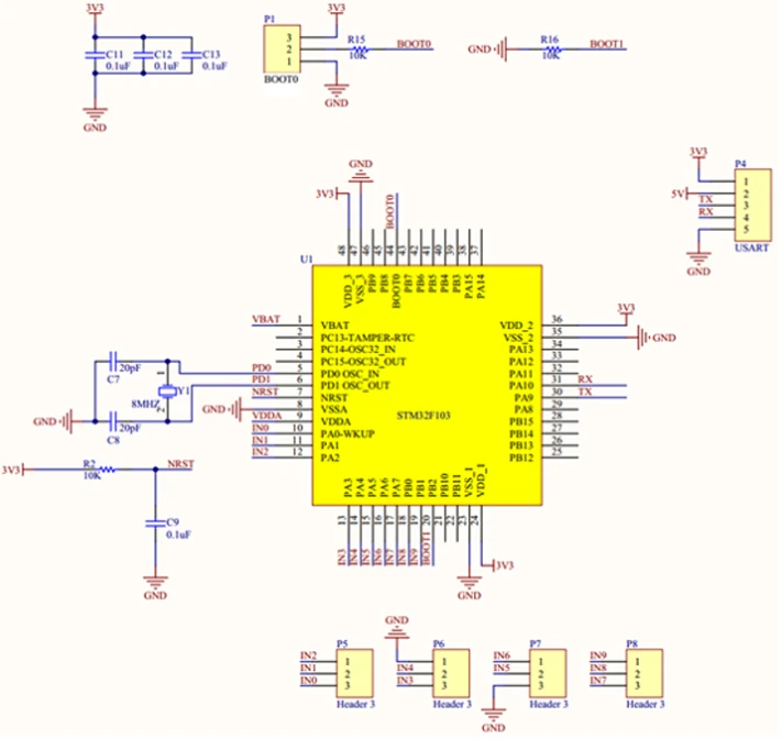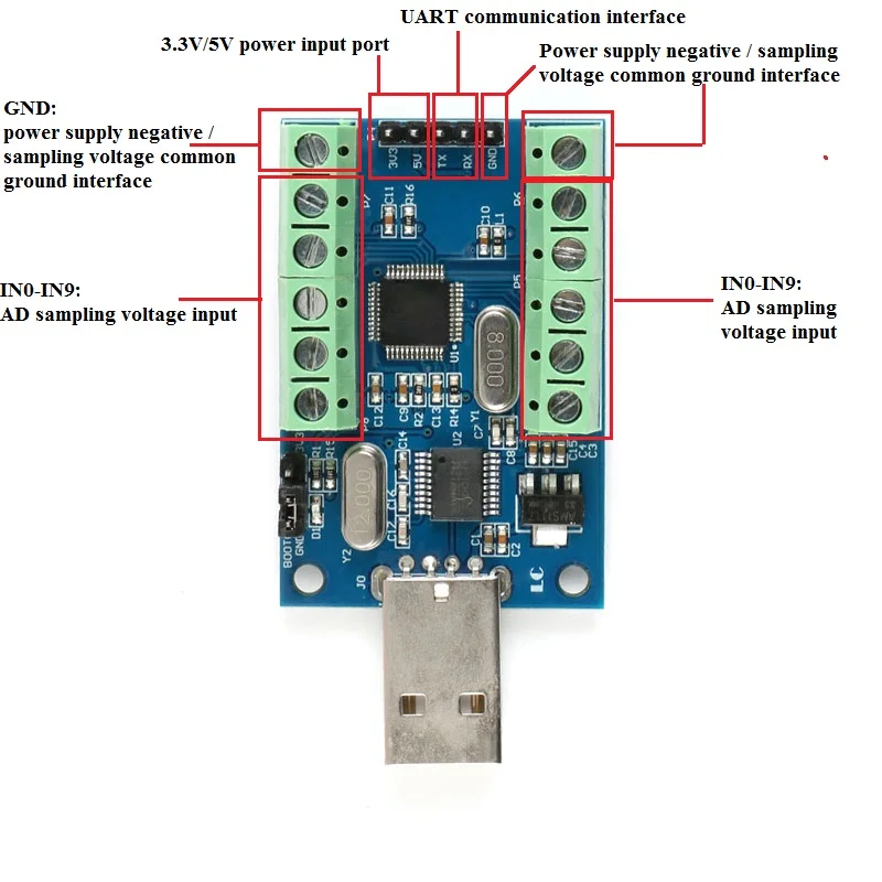 The sampling voltage input terminals IN0-IN9 can be connected or only partially connected. When a certain channel has no sampling voltage input, the output of the channel is a random value, and the unused port can also be modified by itself as a normal I/O port.