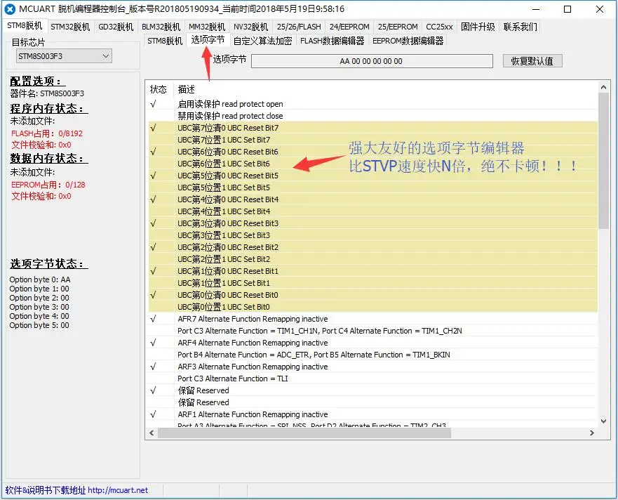 El Editor de bytes de opción fácil de usar garantiza que no esté atascado y sea N veces más rápido que STVP. Se puede configurar la protección de lectura.