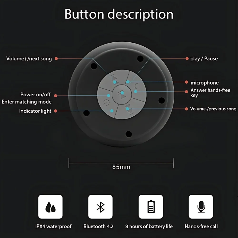 Este es un altavoz inalámbrico Bluetooth diseñado específicamente para la ducha, pero tan ligero y portátil, que puede usarlo en cualquier lugar. La fuerte ventosa sujeta el altavoz firmemente a cualquier superficie lisa, incluso en la ducha húmeda y con azulejos. Con un alcance inalámbrico de 33 pies, su dispositivo puede mantenerse seguro y seco mientras canta melodías en la ducha. El control remoto y el micrófono incorporados le permiten tomar y hacer llamadas, controlar su lista de reproducción y ajustar el volumen, todo directamente desde el altavoz. Completamente cargada, esta potencia compacta puede funcionar hasta 4 horas. Con el altavoz stonego, ¡puedes llevarte la fiesta contigo y nunca perderte el ritmo ni una llamada!