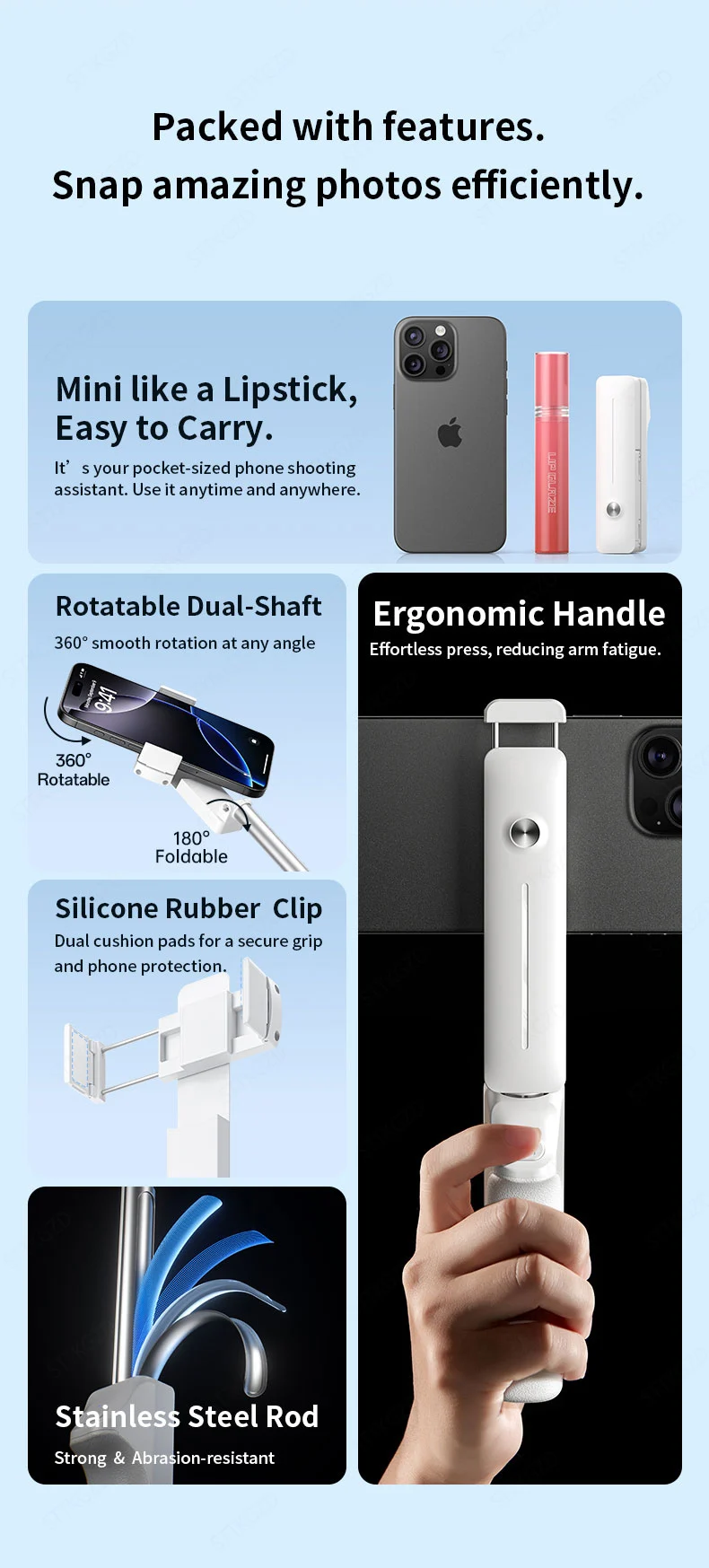 【360° giratorio】El palo para selfies tiene un 360° Soporte giratorio para teléfono móvil.Tome fotografías o grabe vídeos para fiestas, viajes y bodas.¡Siempre podrás encontrar el mejor ángulo de disparo y grabar los mejores momentos!