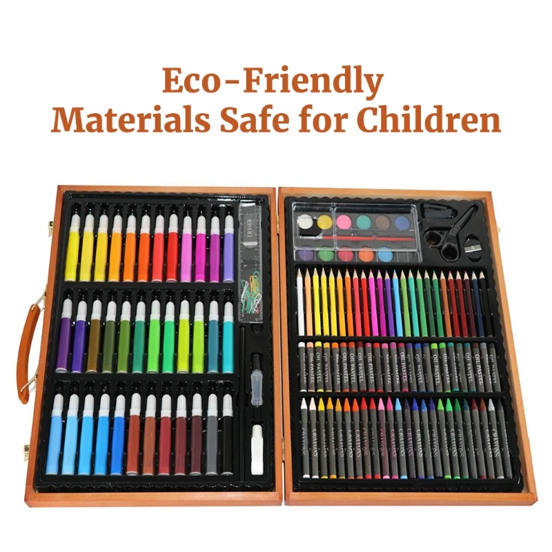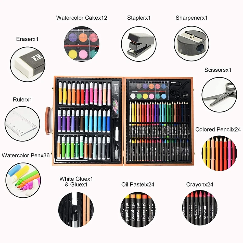 Kits de Pintura Artística de 150 piezas, caja de almacenamiento de madera con sacapuntas, paleta de borrador, lápiz, pincel de pintura, tijeras