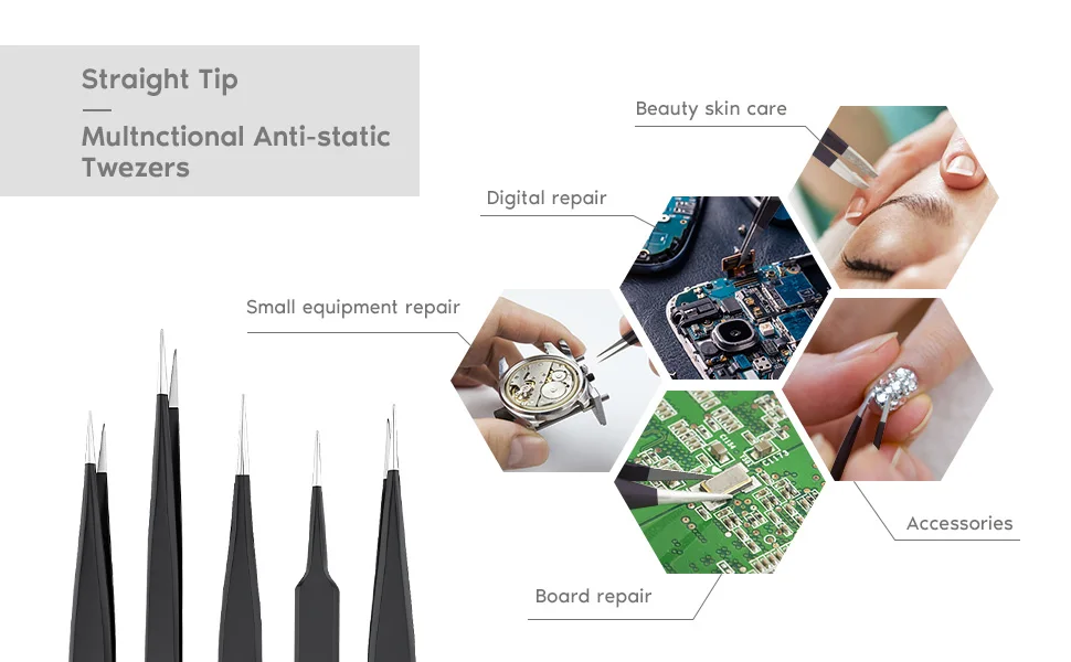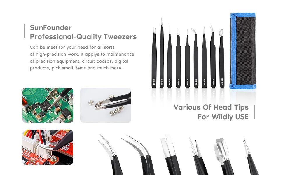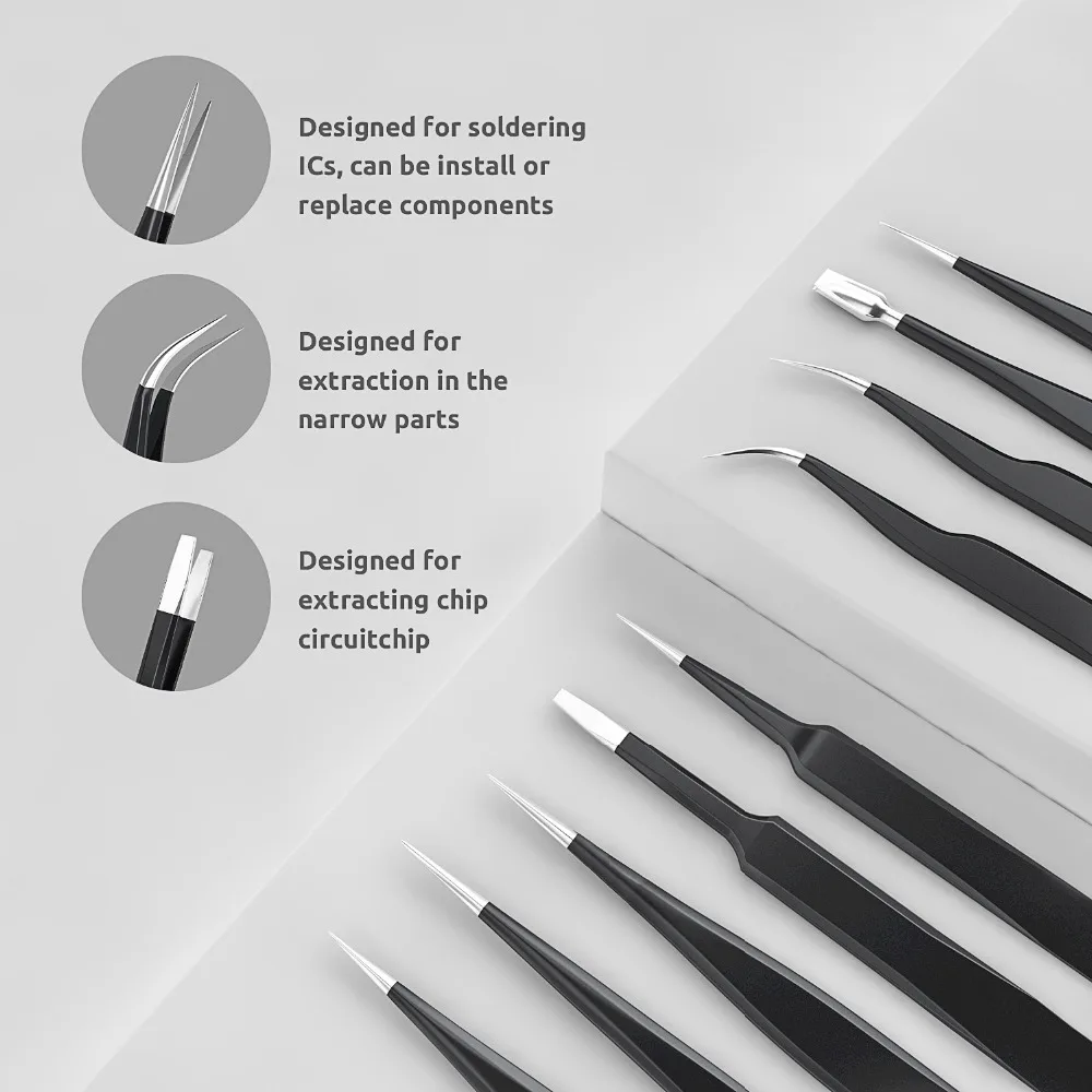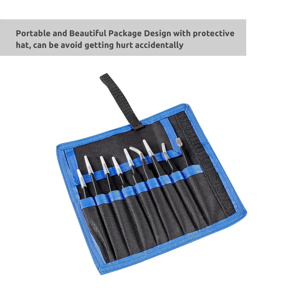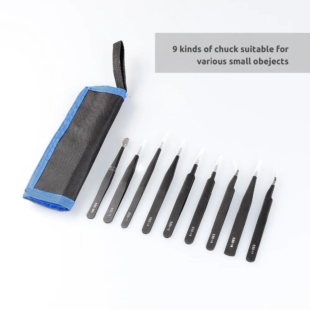 Detalles técnicos Introducción El kit de herramientas de pinzas ESD incluye 9 pinzas con diferentes tamaños y formas puntiagudas. Cada pinza está galvanizada con recubrimiento ESD, que es antiestático, protegiendo así los componentes electrónicos contra daños debidos a la electricidad estática. Hecho de acero inoxidable y no magnético, las herramientas son resistentes a la corrosión por la mayoría de los ácidos y no se pegan con piezas pequeñas y, por lo tanto, mejoran la eficiencia. Este Kit de pinzas está empaquetado en una bolsa de almacenamiento de lona gruesa para una protección completa y un uso portátil, seguro y conveniente. El kit se puede aplicar al mantenimiento de equipos de precisión, artículos como PCB, artículos digitales y otros dispositivos, tecnología de productos electrónicos, joyería y otras bellas artes. Trabajo en tratamiento médico y experimento, etc.