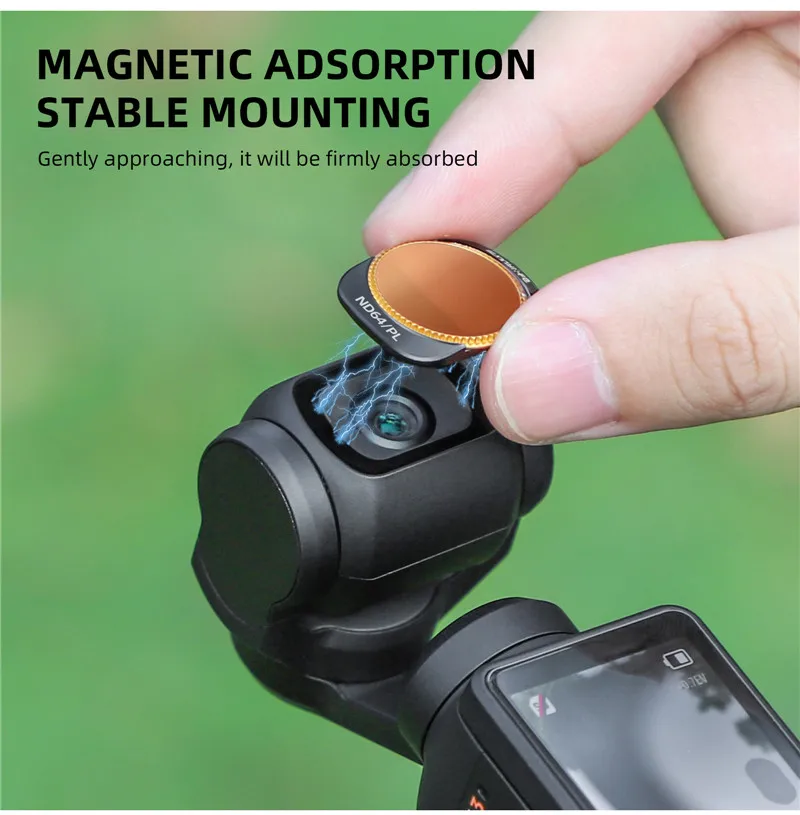 Con el sistema magnético, el filtro se puede instalar en la lente Osmo Pocket 3 de forma rápida y sencilla, no se perderá el maravilloso momento.