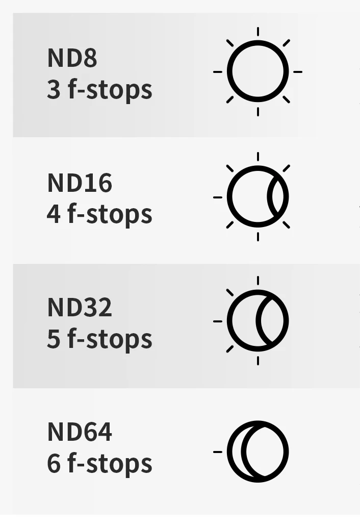 Filtro ND64 6 paradas): este filtro es ideal para condiciones diurnas brillantes y soleadas.El filtro corta la luz que cae sobre la lente mediante 6 f-stops, lo que es inmensamente útil para eliminar el efecto "Hola" visto debido al obturador enrollable de la cámara y dar un movimiento de desenfoque natural al metraje.