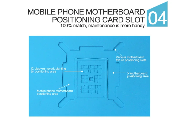Con ranuras especializadas para todas las placas base de teléfonos móviles (incluidos IPX y otros modelos), garantiza una alineación estable durante la extracción de pegamento IC, la plantación de estaño o el reposicionamiento de componentes.Una "Área de posicionamiento de estaño para plantar, que se elimina con pegamento IC" simplifica reparaciones complejas.