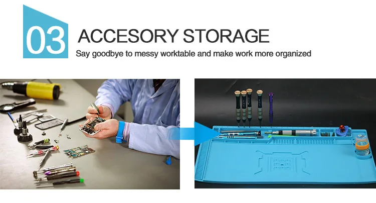 Diseñada con funcionalidad magnética, esta almohadilla sujeta de forma segura destornilladores y herramientas pequeñas, eliminando el desorden.Múltiples ranuras para accesorios mantienen los tornillos, pinzas y soldadores perfectamente organizados.