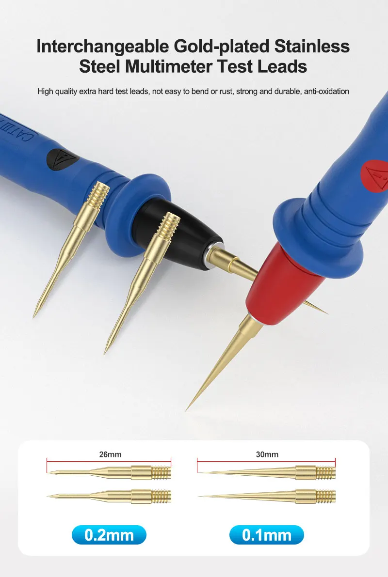 -Detección de precisión de componentes pequeños, punta especial intercambiable de plomo de acero inoxidable chapado en oro, punta de 0,1/0,2 mm, admite una variedad de mediciones, etc.