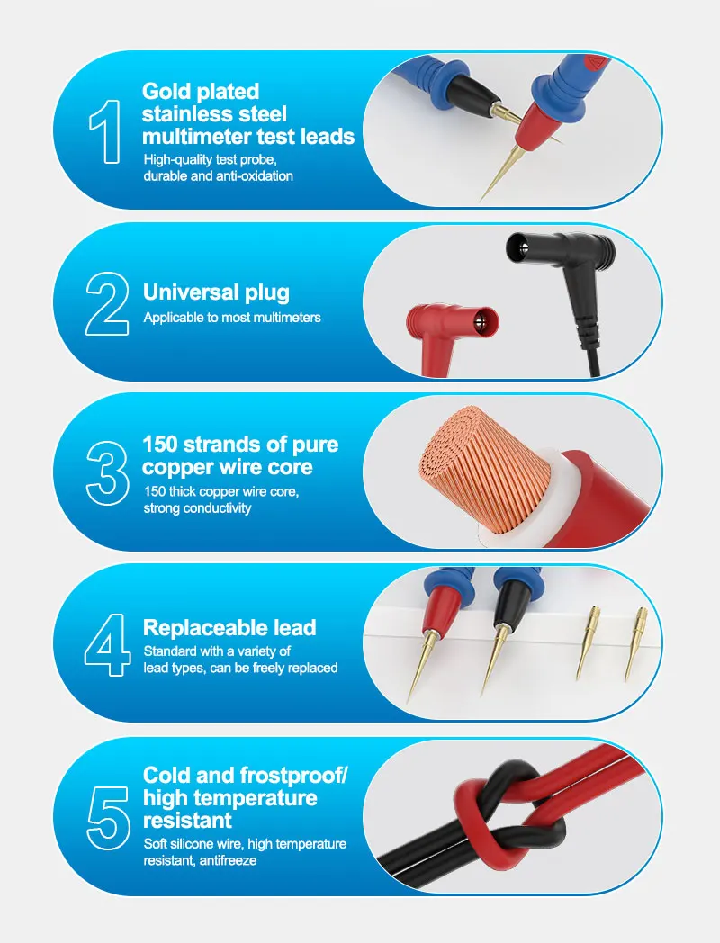 -Muchos núcleos/alta precisión y más seguros, cables de prueba de multímetro de acero inoxidable chapados en oro intercambiables