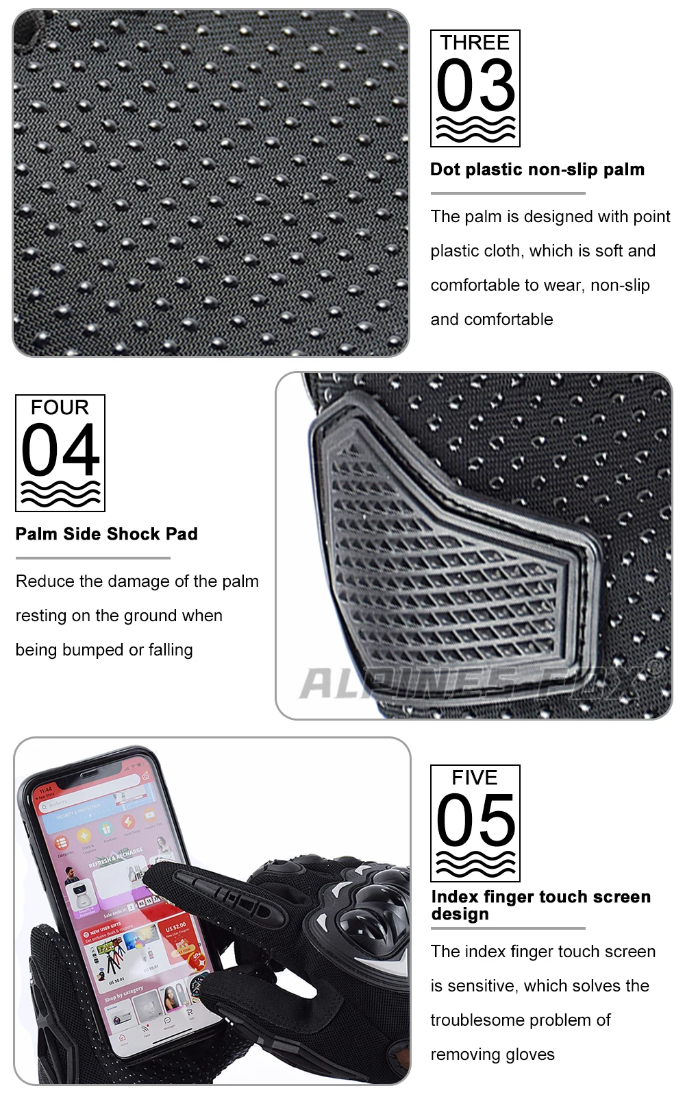 1. El diseño de ajuste del diablo de la muñeca. Deje que el guante no sea fácil de caer2.Durable, soft and flexible, comfortable and breathable3. fuera de carretera carreras de motos adecuado para ciclismo, pesca, escalada y otros deportes al aire libre 4. Diseño de dedo de pantalla táctil, sensible para tocar su teléfono.