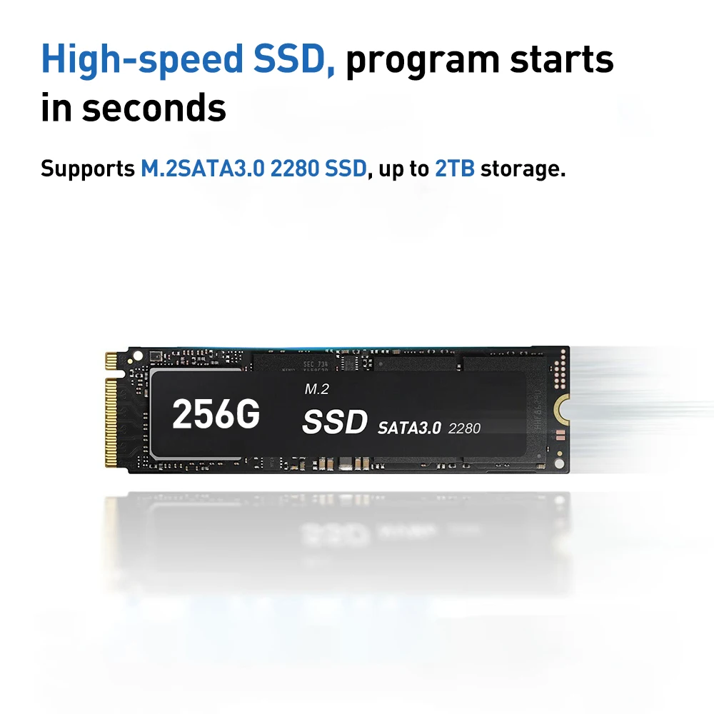 MP100 mejora enormemente la velocidad de lectura y escritura.El SSD M.2 SATA3 de 256 GB proporciona suficiente capacidad para almacenar imágenes, vídeos, música, etc., satisfaciendo fácilmente sus necesidades diarias de almacenamiento.