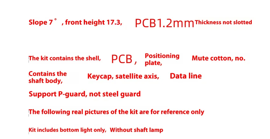 El kit incluye una carcasa, PCB, placa de posicionamiento, algodón silencioso, no incluye interruptor, tecla, interruptor satélite, cable de datos compatible con satélite P, no admite satélite de acero