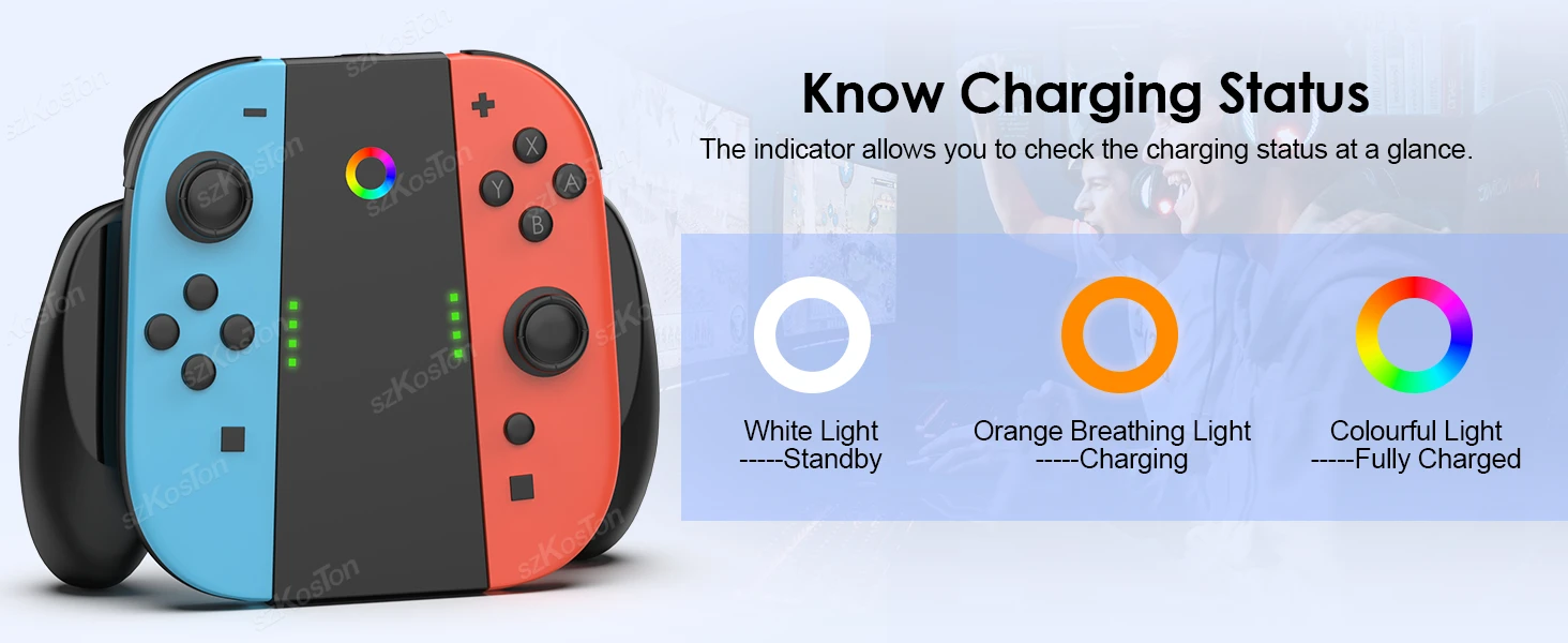 Indicador de carga multimodo: durante la carga, el indicador de carga LED redondo cambia de luz blanca de espera a luz de respiración naranja.Cuando el controlador esté completamente cargado, la luz indicadora cambiará exclusivamente a siete colores.Las cuatro luces indicadoras en el centro de dos filas son pantallas luminosas para los papeles asignados de los reproductores del controlador izquierdo y derecho, lo que brinda una experiencia de juego cómoda y cómoda.Szkoston