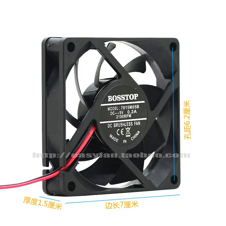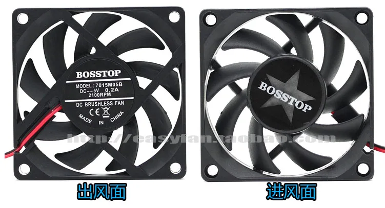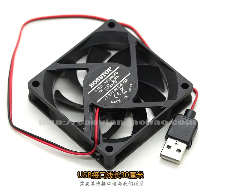 Modelo del producto: de la apariencia Dimensión 7015M05B: 70mm × 70mm × 15mm Referencia de velocidad: 2100RPM Tipo de rodamiento: rodamiento hidráulico Vida útil: 30000 horas Referencia de ruido: 20 dBA Voltaje nominal: corriente nominal de 5V: 0.20A Tipo de interfaz: pequeña interfaz USB de 2 pines o original Longitud del cable del ventilador: pequeña longitud del cable 2P 20cm, Cable de interfaz USB de 30cm Tipo de embalaje: embalaje de caja grande industrial, sin embalaje único
