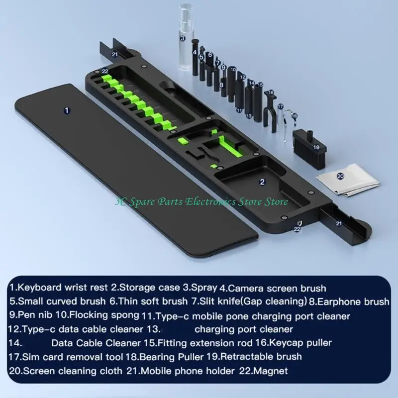 Cuenta con cepillos y paños de microfibra especializados para una limpieza profunda de teclados mecánicos, lentes de cámaras, puertos de carga y otros dispositivos electrónicos delicados.