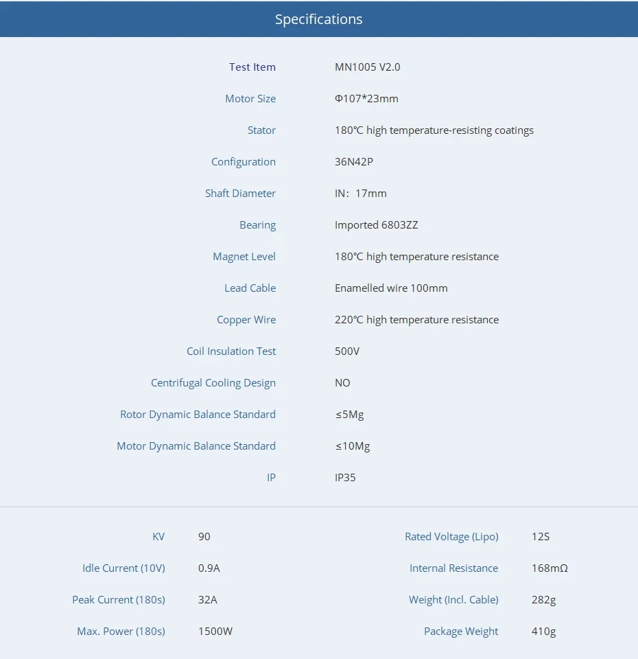 Descripción de productos Motor de avión ultraligero MN1005 V2.0 KV90, gran empuje, antigravedad, 1005 V2.0, motor sin escobillas, 11,5 g/W, 3kg, Embalaje del producto • Vida útil de 1000 horas • Eficiencia de hasta 11,5 g/W a 3kg • Aluminio de aviación importado alemán 7075 • El motor solo pesa 282G Imágenes detalladas