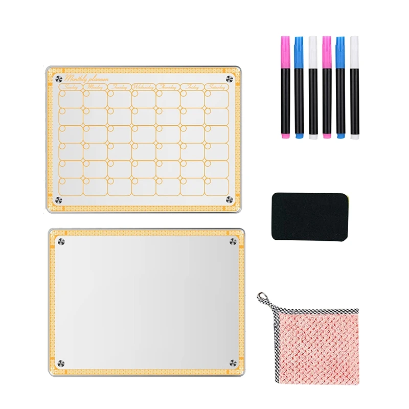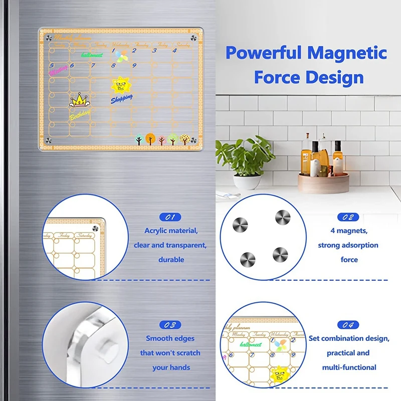 Calendario magnético de toallitas secas y juego de notas Calendario magnético de refrigerador acrílico es un producto diseñado específicamente para planificar su vida diaria. El elegante panel de calendario magnético acrílico transparente y el conjunto de notas le permiten escribir más contenido. El panel de 15,74 pulgadas x 11,81 pulgadas ahorra espacio y organiza su vida diaria y la de su familia a través de un tablero de planificación elegante.