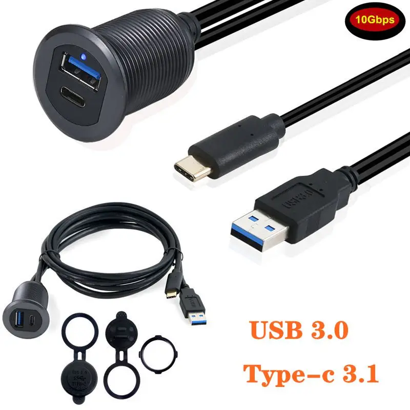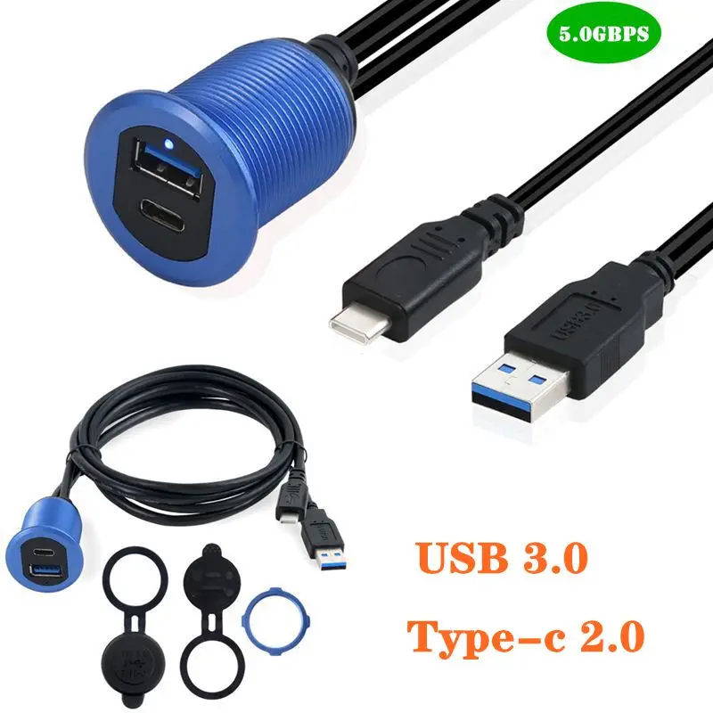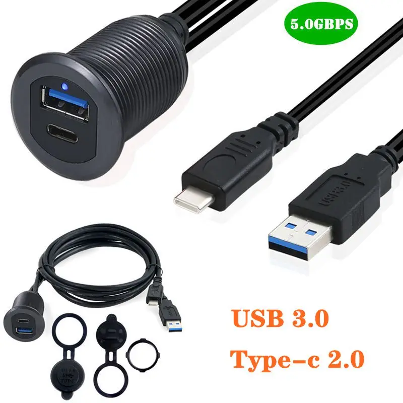 Luz LED tipo C 2.0 y USB 2.0/3,0 macho a hembra, AUX, Cable empotrado para montaje en coche, extensión impermeable para coche, camión, barco, motocicleta, panel de tablero, -3 pies