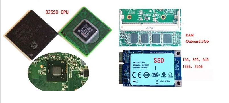 Intel ATOM D2550 1,86 GhzRAMRAM integrada DDR3L de 2GB (4Gb máx.)HDDSSD32GbAudio1 x AMP 2W (altavoz interno) opcionalSysWindows 7 (preinstalación) Windows XP/ win7LAN2 x RJ45 Intel RTL8111E 1000MbpsInalámbrico (opcional)IEEE 802.11a/b/g/n/acIO1 x Puerto RS-485 COM