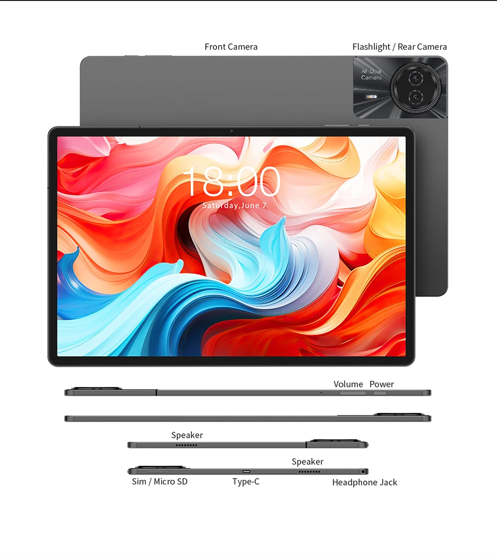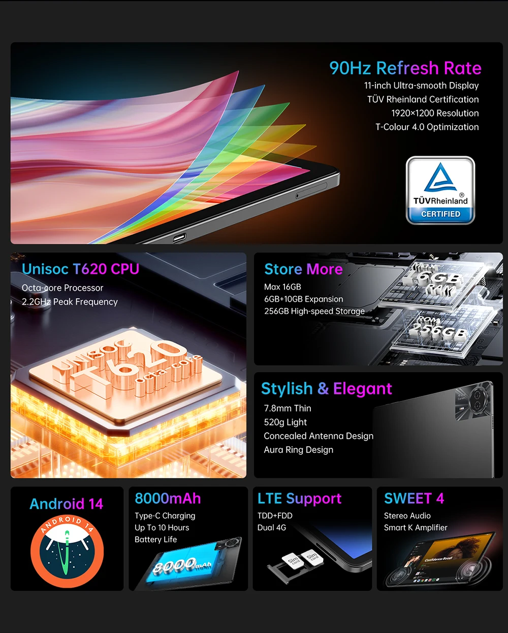 Núcleo Octa Unisoc T620, 2 x A75-2,2 Ghz @ 6 x A55-1,8 GHz; GPU: Arm Mali G57 MC2