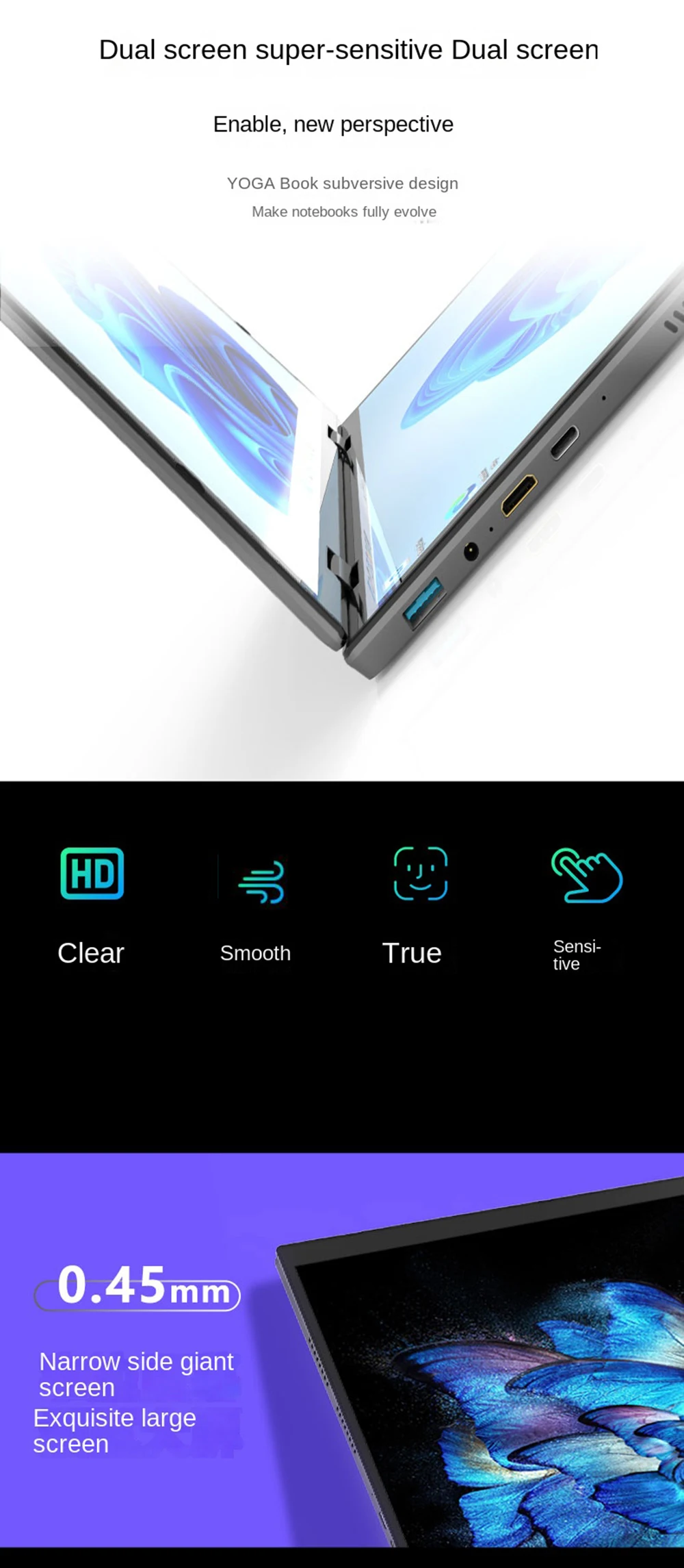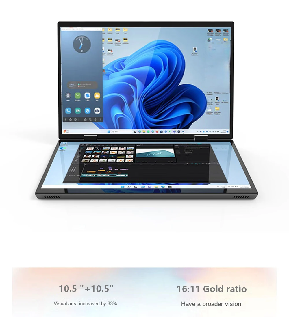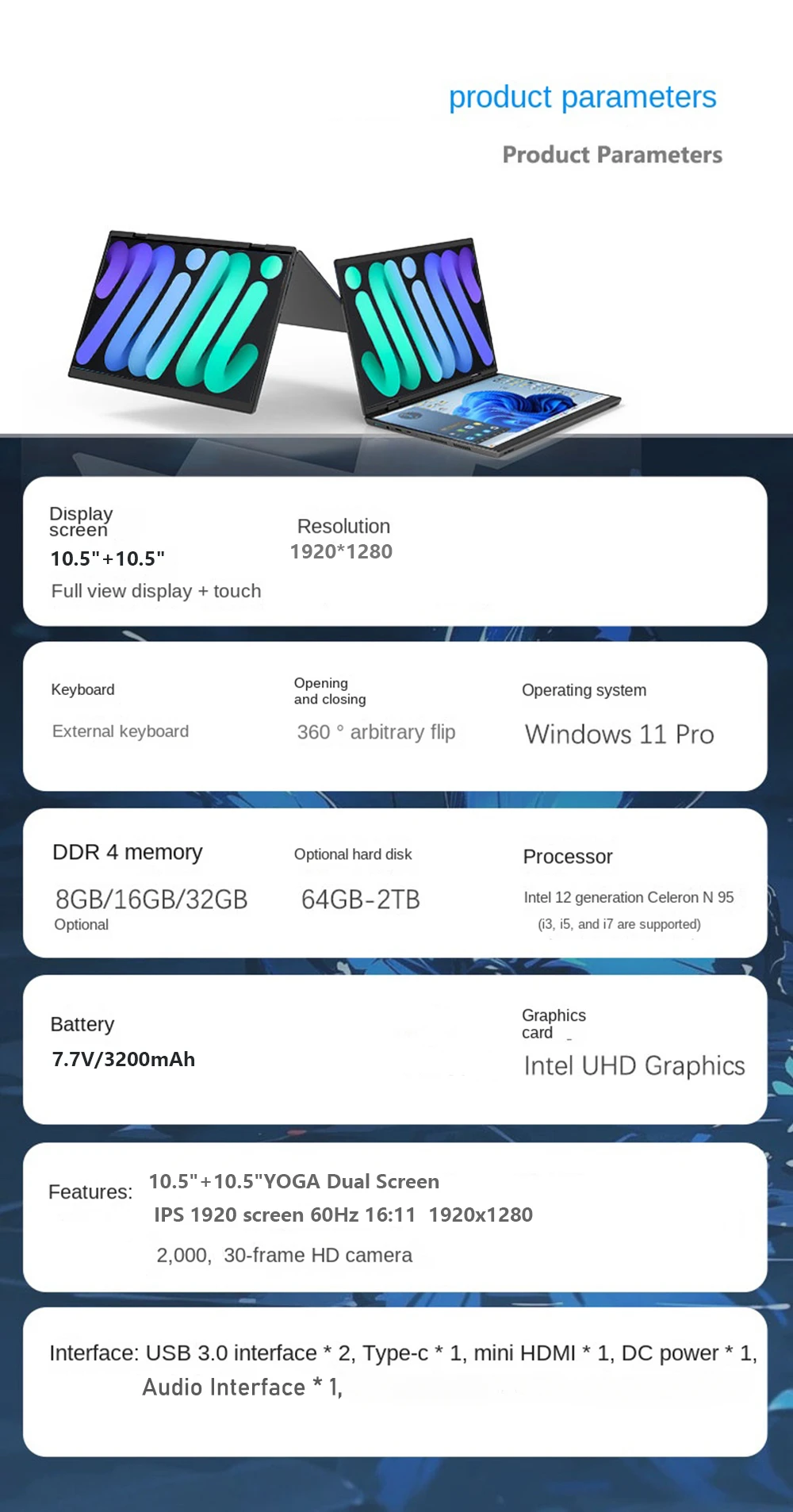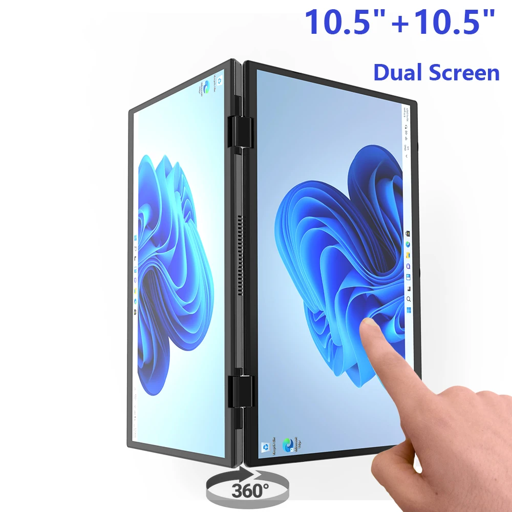 Formulario del producto Nombre: 10,5 + 10,5 "YOGA Dual Screen Flex Laptop Material: aleación de aluminio A-shell/D-shell, B/C para pantalla táctil IPS Color: Gris oscuro Tamaño del producto: 235*170*18mm Peso del producto: 0,95 kg Diseño destacado Pantalla dual de 10,5 pulgadas, control táctil dual, escritura a mano dual; soporte de pantalla giro de 360 ° (con detección de gravedad), reproducción ilimitada; aleación de aluminio; resolución de pantalla de 1920*1280; 200W30 marcos de cámara HD Pantalla Pantalla táctil dual de 10,5 + 10,5 pulgadas, pantalla IPS 1920 60Hz 16:11, Resolución 1920*1280 Teclados Soporte teclado externo CPU Procesador Intel® N95,4Cores4Threads ,Max Turbo Frequency3.40GHz Memoria