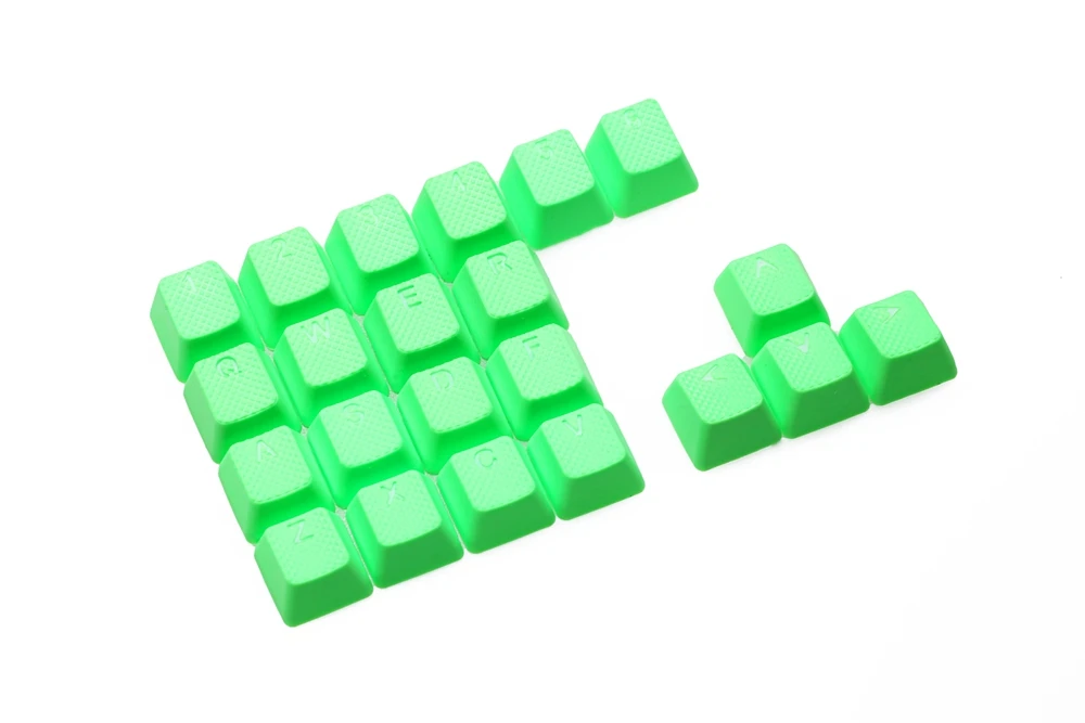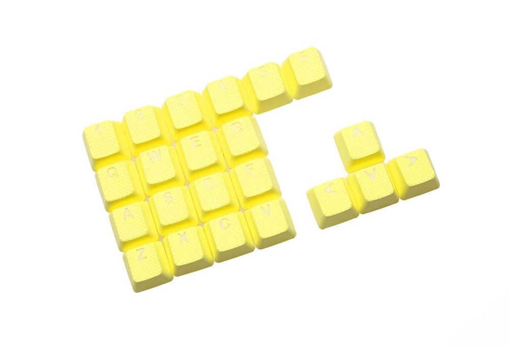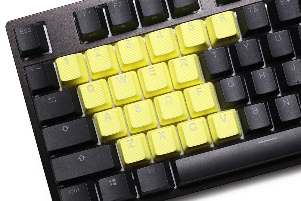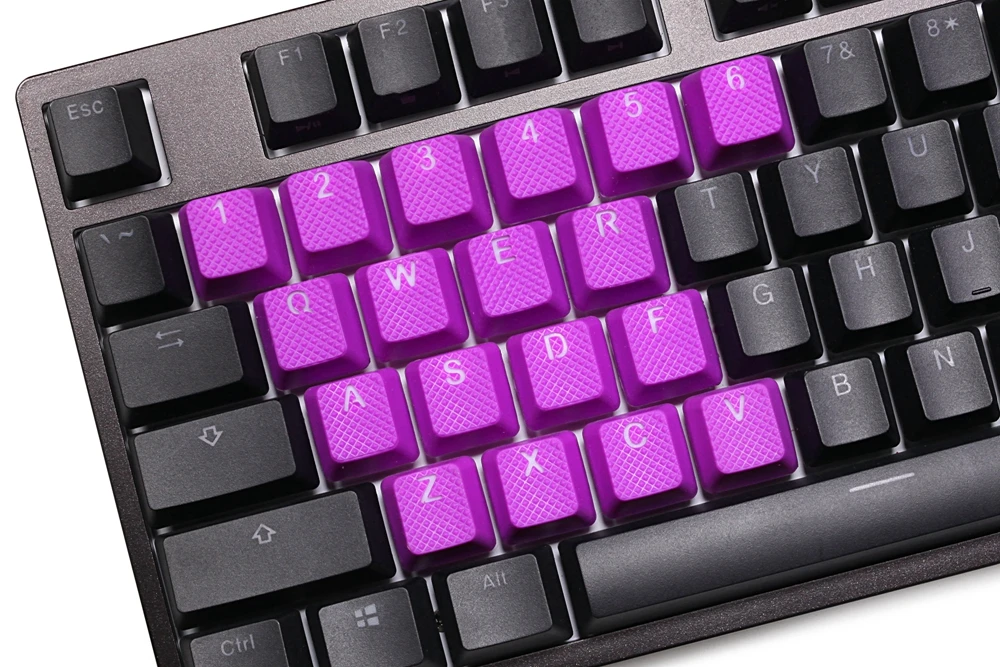 Now we’re offering a new, improved version as a set of 22. These doubleshot shine-through keycaps feature a rubberized finish with a non-slip diamond texture. Offering intuitive finger positioning, the set consists of numerals 1 through 6, four arrow keys, Q, W, E, R, A, S, D, F,Z,X,C,V in a sharper font. Also included is a key puller.