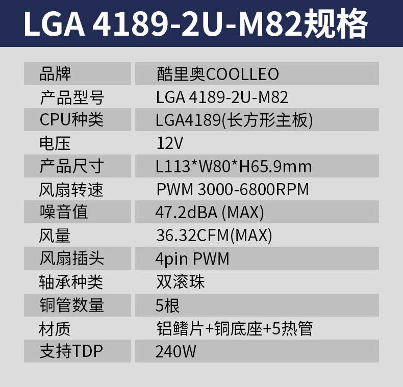 2U-M82 2U Server CPU Radiator Socket LGA 4189 Rectangle Product Size 113X80X65.9mm 12V 4pin PWM Two Ball Bearing Power Consumption 240W