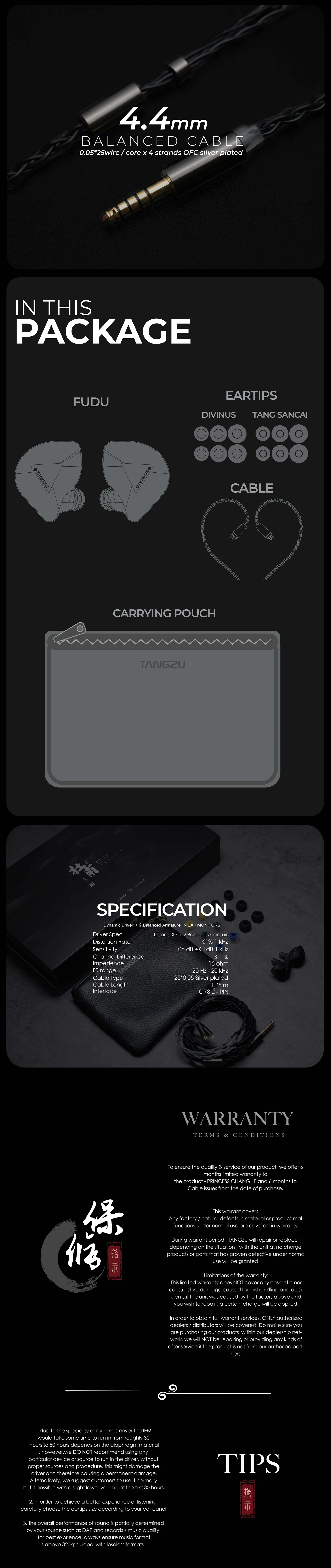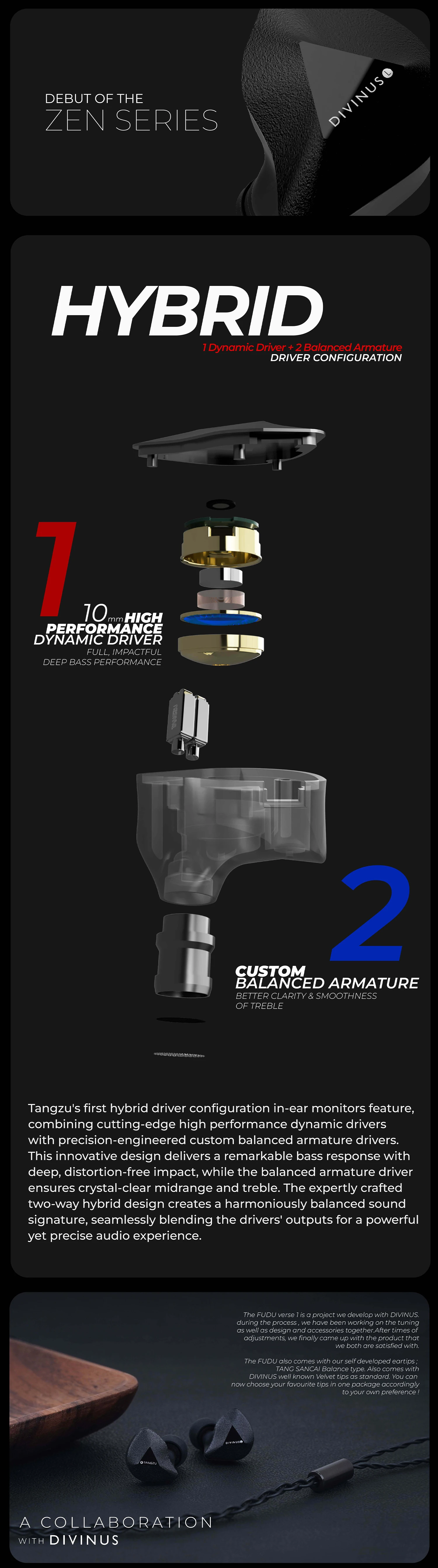 Presentamos el nuevo Tangzu FuDu Verse 1, los primeros monitores internos híbridos del controlador de Tangzu.Equipado con un controlador dinámico de 10 mm y dos controladores de armadura balanceada personalizados, el Tangzu FuDu ofrece un sonido maravilloso con una potente gama inferior, un rango medio encantador y una respuesta de agudos nítida y abierta.Tangzu ha diseñado el FuDu Verse 1 como un proyecto colaborativo con Divinus que presenta sus almohadillas de terciopelo ampliamente aclamadas.¡El par tiene un diseño minimalista basado en la filosofía Zen con cubiertas faciales metálicas mecanizadas por CNC y cavidades de resina impresas en 3D!!